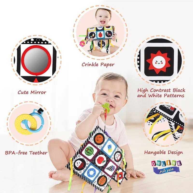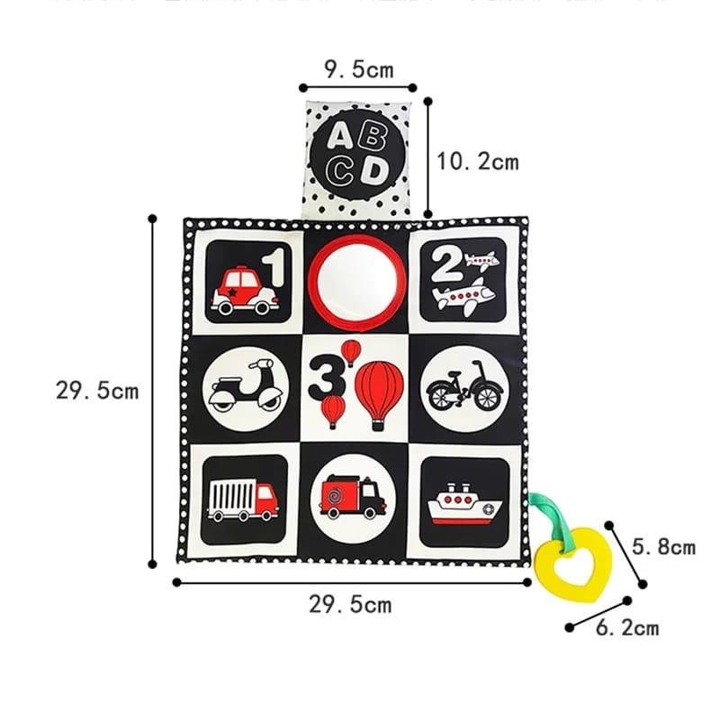 لوحة قماشية ناعمة بتصميم ذكي يجمع بين الألوان عالية التباين (أسود، أبيض، أحمر) لتحفيز نظر الطفل وتركيزه البصري.