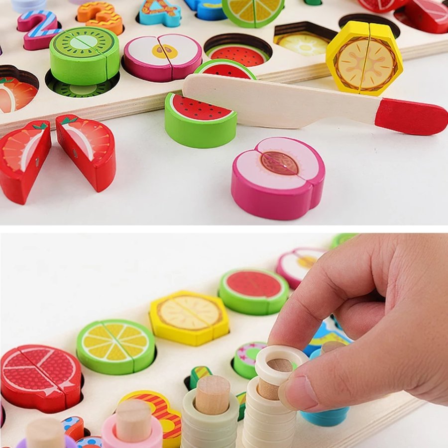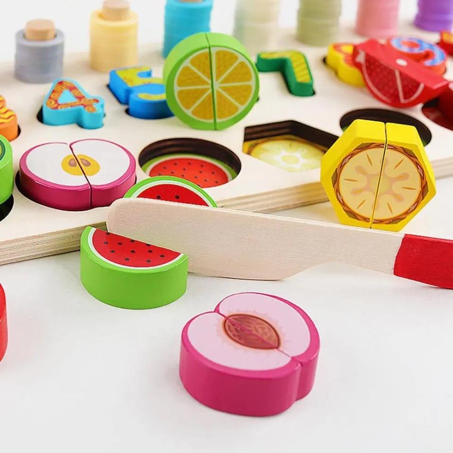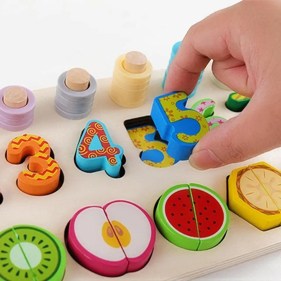 لعبة تعليمية خشبية متعددة العناصر، صُممت لتكون مساحة تفاعلية مليئة بالألوان والمرح، تساعد الطفل على اكتشاف الأرقام والفواكه بطريقة ملموسة وبصرية. اللوحة البيضاء المستطيلة تحتوي على صفوف منظمة من الأرقام، الفواكه، الحلقات ، مما يخلق تجربة غنية ومتنوعة في كل جلسة لعب.