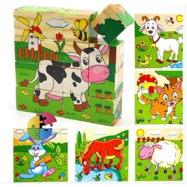 مجموعة بازل خشبية مكونة من مكعبات يمكن ترتيبها لتشكيل ستة مشاهد كرتونية مختلفة، كل منها يصوّر حيوانًا لطيفًا يقود وسيلة نقل ممتعة. من الأرنب على الدراجة إلى التمساح على الجيت سكي، كل مشهد مليء بالألوان والتفاصيل التي تشجع الطفل على التفكير، التركيب، والاستكشاف.