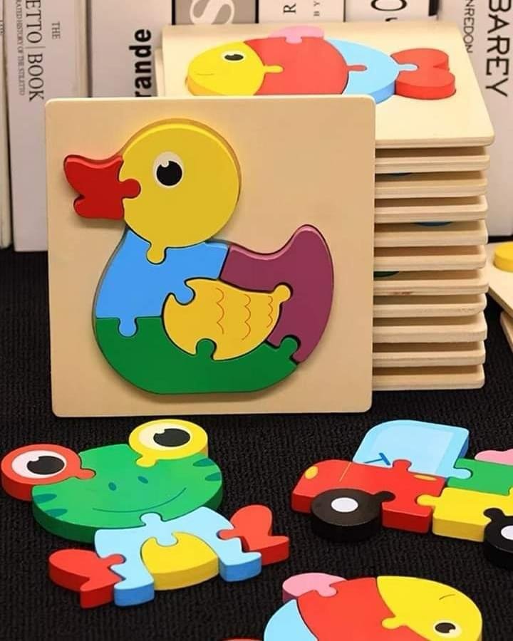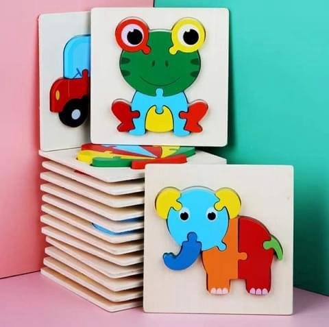 مجموعة من ألواح البازل الخشبية الملونة، كل منها يحتوي على صورة كرتونية مبهجة لحيوان أو مركبة، مقسّمة إلى قطع متشابكة تساعد الطفل على التركيب والتعرف على الأشكال. تشمل التصاميم ضفدع بعيون كبيرة، فيل بألوان زاهية، ومركبة حمراء، مما يضفي جوًا من المرح والتنوع