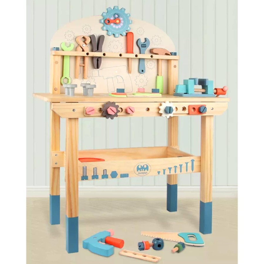 طاولة خشبية متكاملة تحتوي على مجموعة من الأدوات المصغّرة مثل المطرقة، المفك، المنشار، الكماشة، والمسطرة، بالإضافة إلى تروس وصواميل يمكن تركيبها وفكها. التصميم يشمل رفوف للتخزين ولوح خلفي لتعليق الأدوات، مما يمنح الطفل تجربة واقعية في اللعب التخيلي وكأنه يعمل في ورشة صغيرة خاصة به.