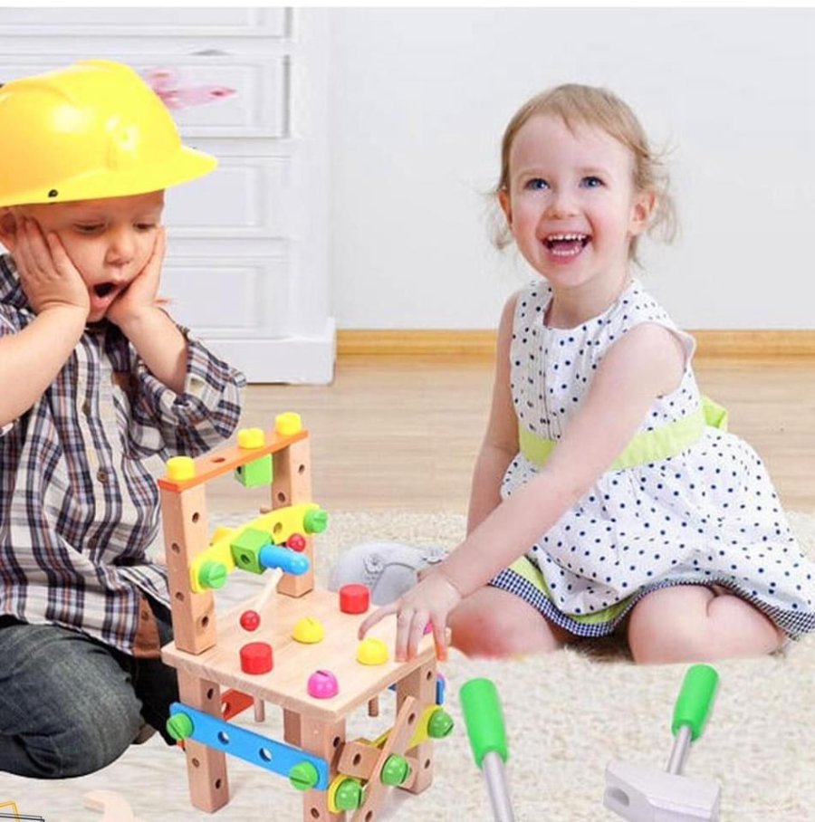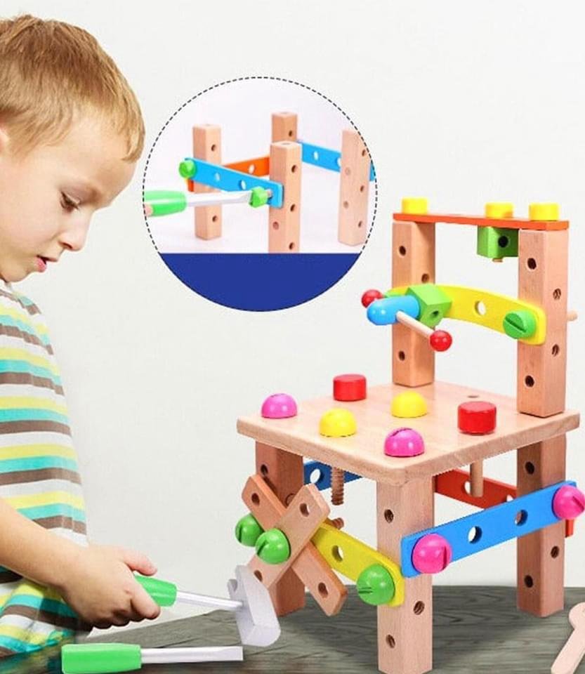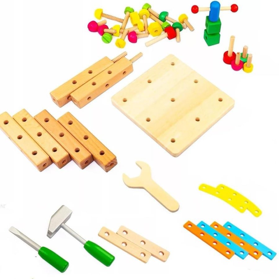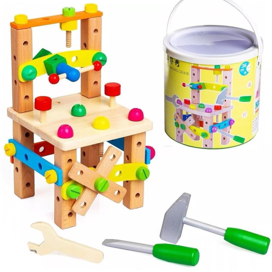 مجموعة تعليمية خشبية تحتوي على قطع ملونة مثل البراغي، الصواميل، الألواح، وأدوات اللعب مثل المطرقة والمفك والمفتاح. يمكن للطفل استخدامها لبناء أشكال متعددة، مثل كرسي صغير أو هيكل هندسي، مما يعزز مهاراته في التركيب والتخيل. تأتي المجموعة داخل علبة أسطوانية أنيقة، مما يسهل التخزين والنقل.