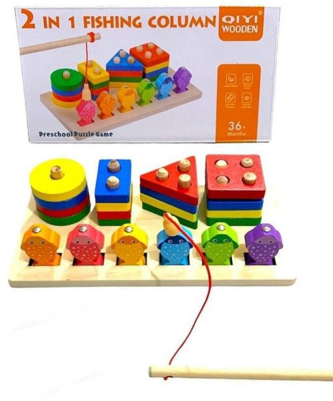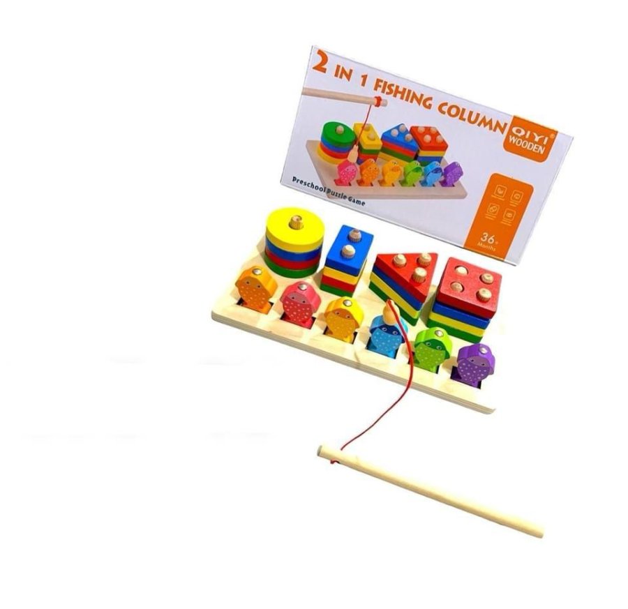 لعبة خشبية تفاعلية مناسبة لعمر 3 سنوات فما فوق، تُشجّع الطفل على تنمية المهارات الحركية الدقيقة من خلال تكديس الأشكال الهندسية على الأعمدة، وصيد الأسماك المغناطيسية باستخدام السنارة. كل قطعة ملوّنة ومصممة لتُحفّز التنسيق بين اليد والعين، التعرّف على الأشكال، واللعب التخيّلي.