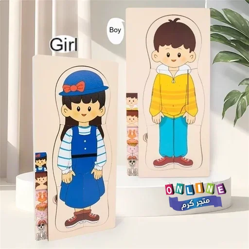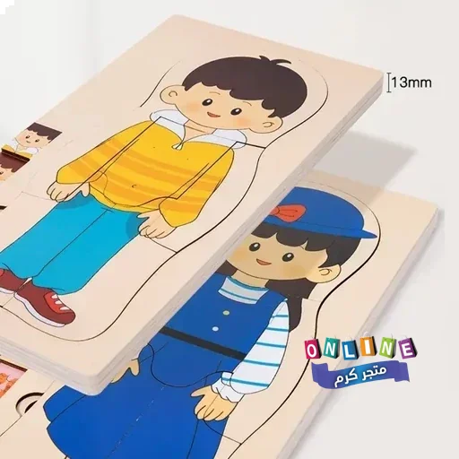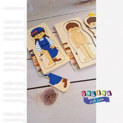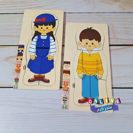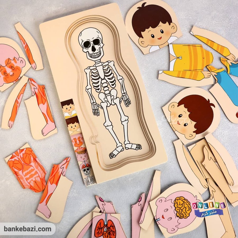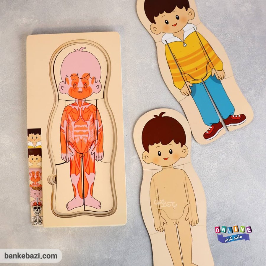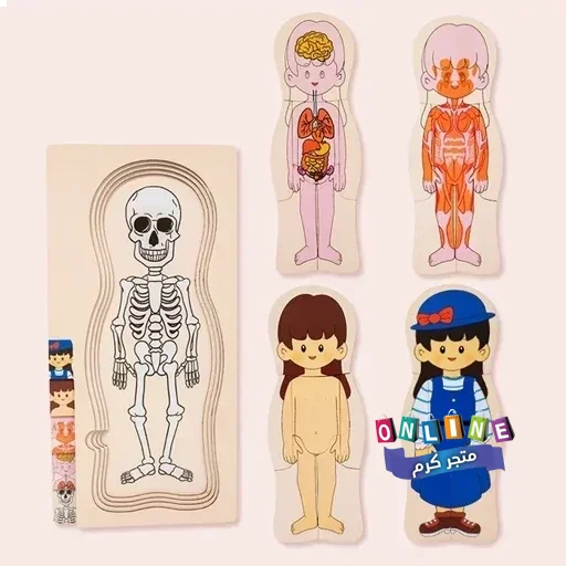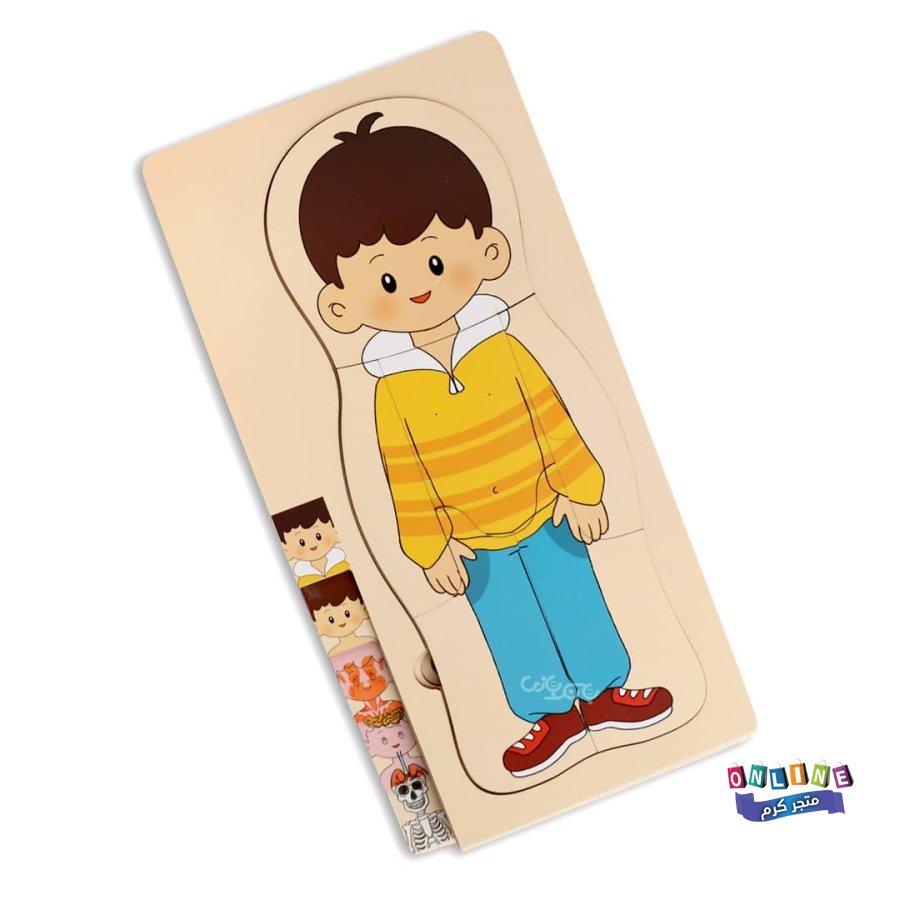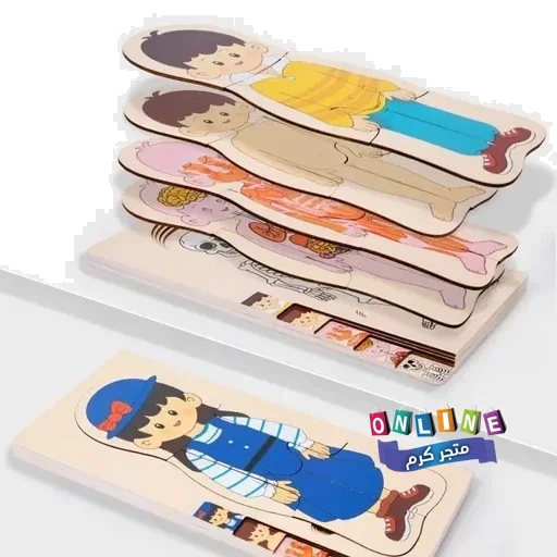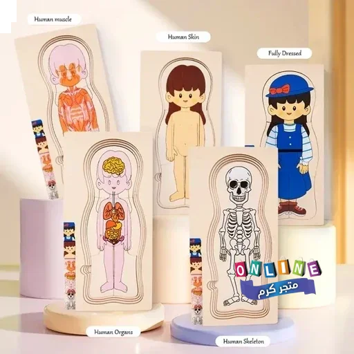 بازل خشبي طبقي يعرض مكونات الجسم بطريقة مرئية وتفاعلية: الملابس، الجلد، العضلات، الأعضاء، والهيكل العظمي.