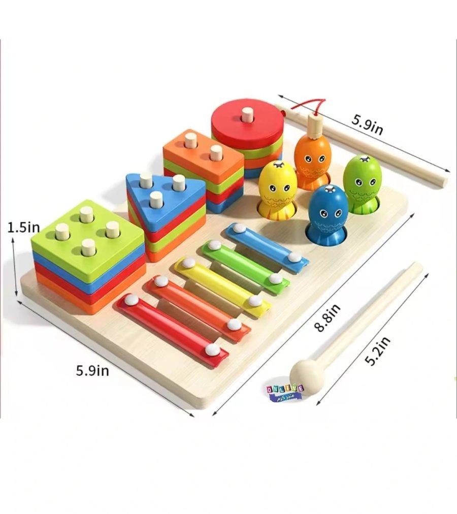 تحتوي على آلة موسيقية ملونة، وأشكال هندسية يمكن ترتيبها حسب اللون والشكل، بالإضافة إلى لعبة صيد الأسماك اللطيفة 🎣.