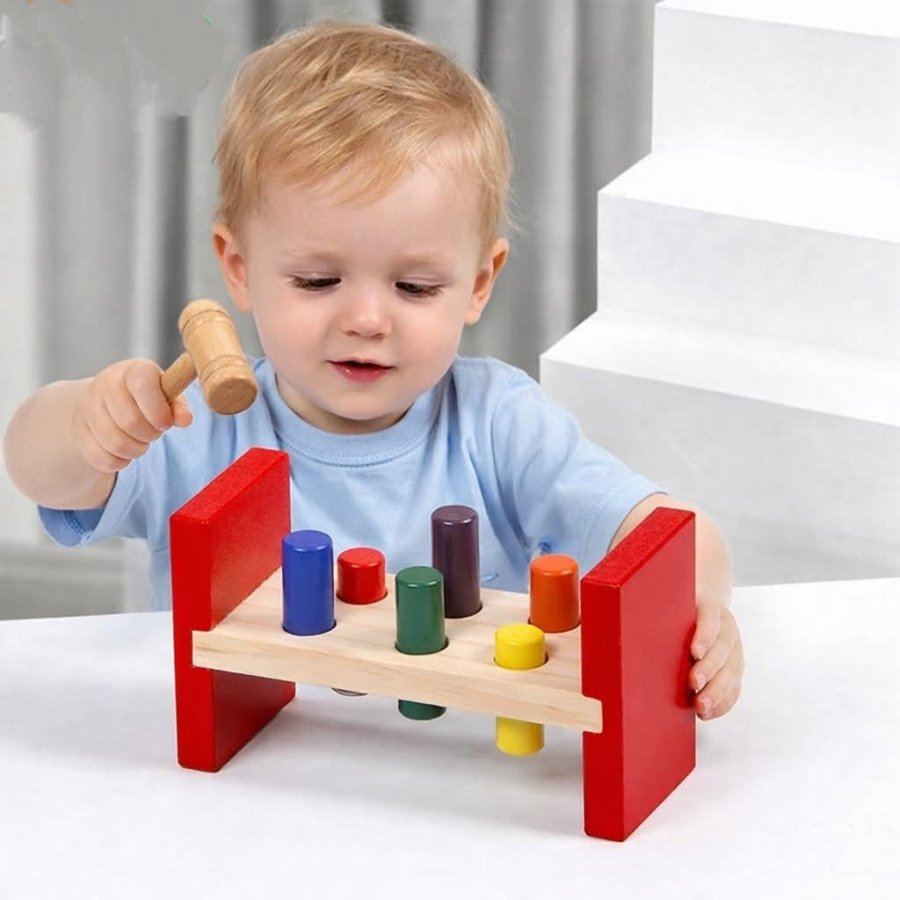 تحتوي على مجموعة من الأوتاد الملونة المثبتة داخل قاعدة خشبية، ومطرقة صغيرة بيد الطفل بتخليه يضرب الأوتاد ويشوفها تنزل وتطلع، في تجربة تفاعلية مليئة بالحماس والفضول.