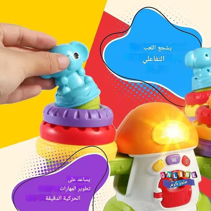 تتضمن حلقات تكديس ملونة وشخصيات حيوانات لطيفة (قرد وضفدع).