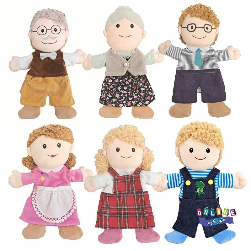 هذه مجموعة مكونة من 6 دمى مصممة كدمى يدوية، تصور شخصيات عائلية تشمل الأجداد (الجد والجدة)، والوالدين (الأب والأم)، والأطفال (الابن والابنة).