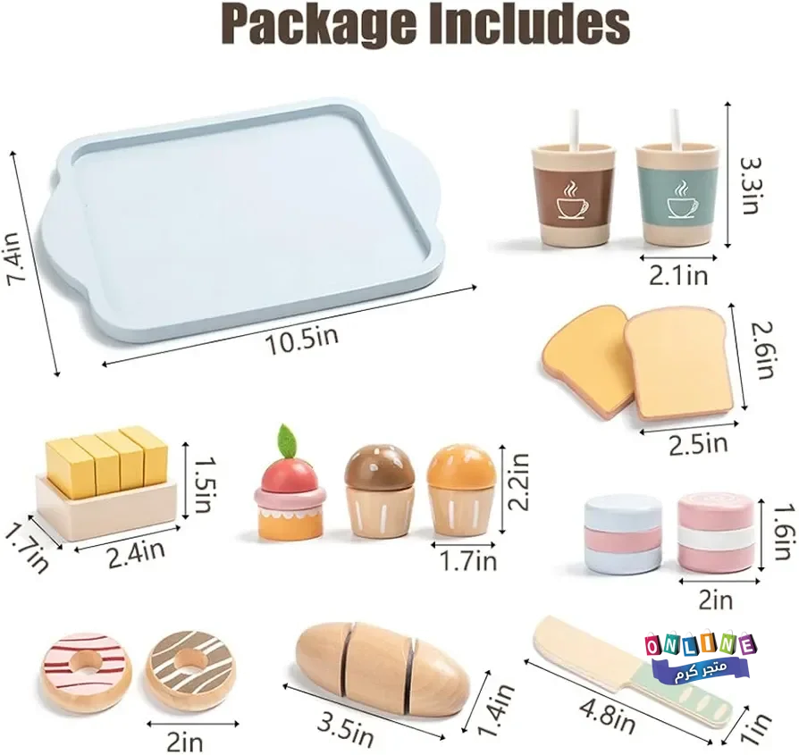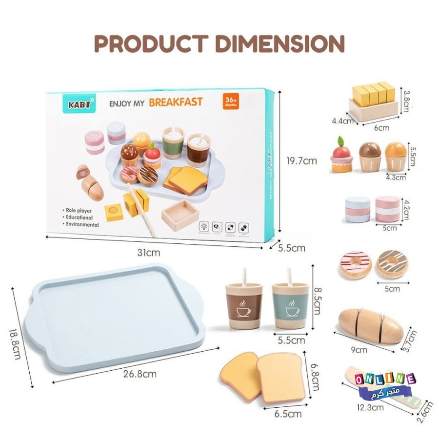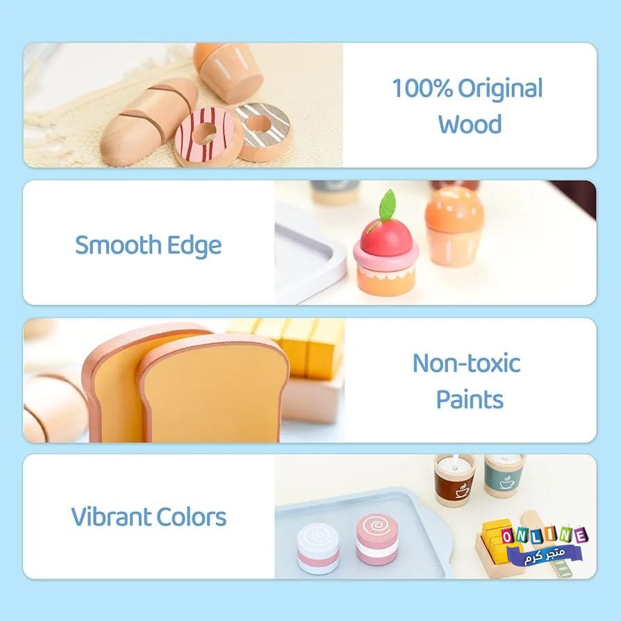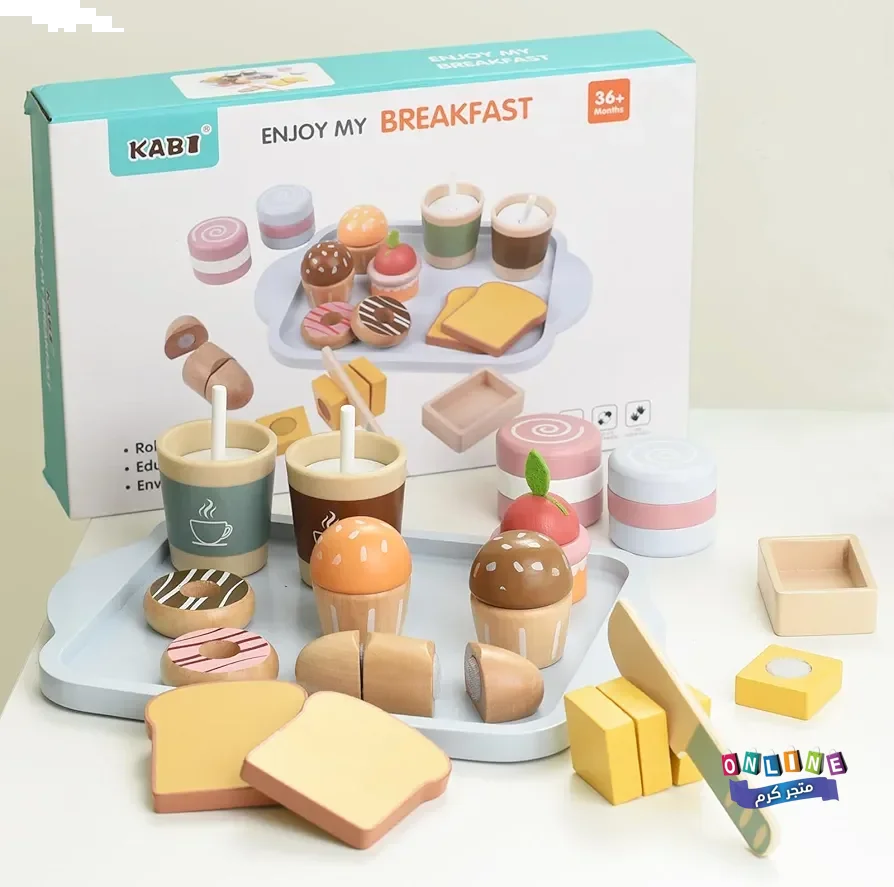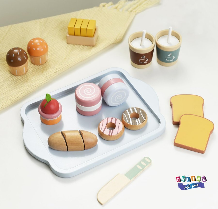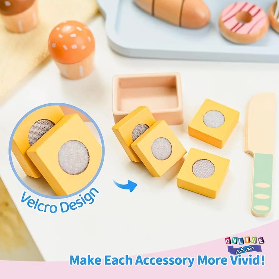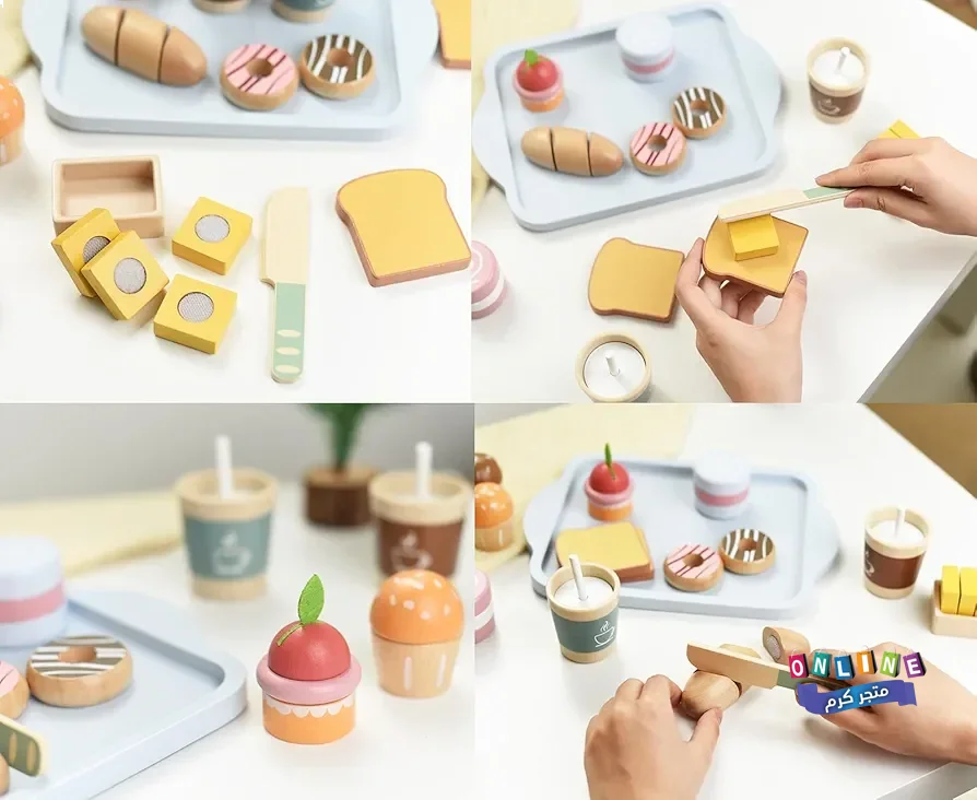 لعبة محاكاة ممتعة تتضمن مجموعة الإفطار خبزًا وكعكة. يُقسّم الخبز إلى عدة قطع، وسطح القطع أكثر وضوحًا ونعومة وخالية من النتوءات، مما يحمي أيدي الطفل الصغيرة. مجموعة واحدة من ألعاب المطبخ التظاهرية.
