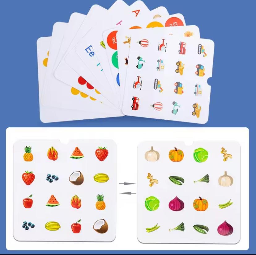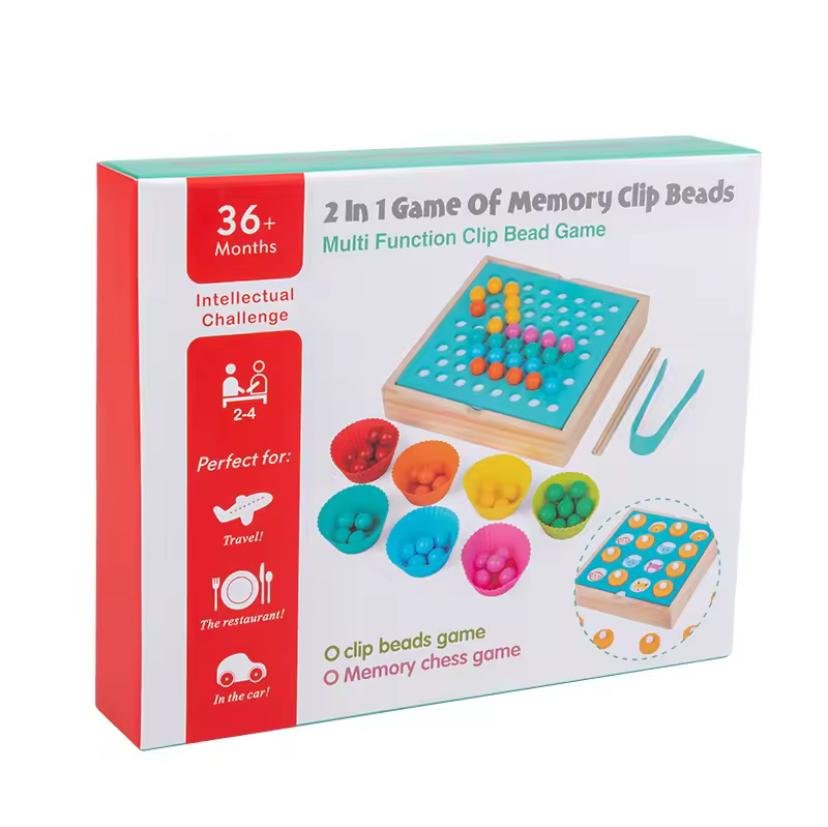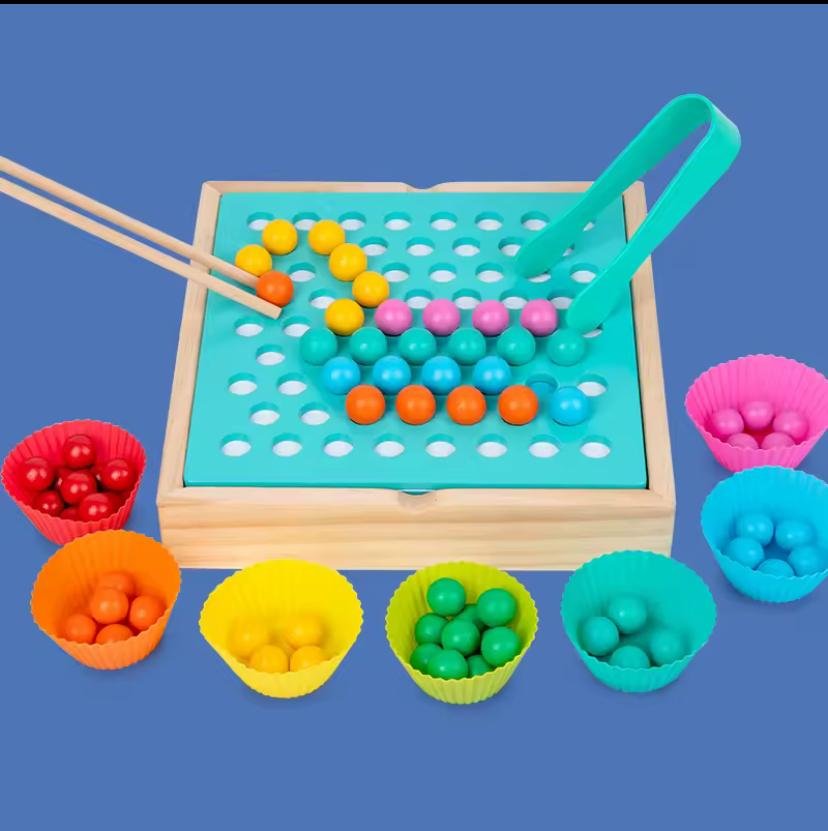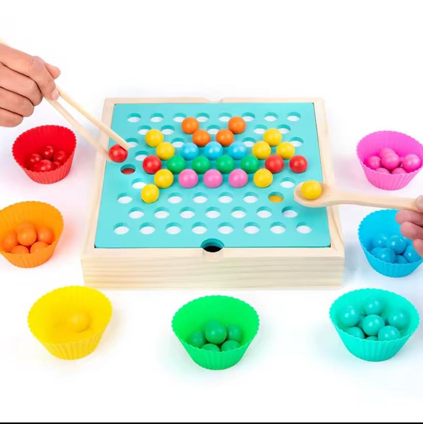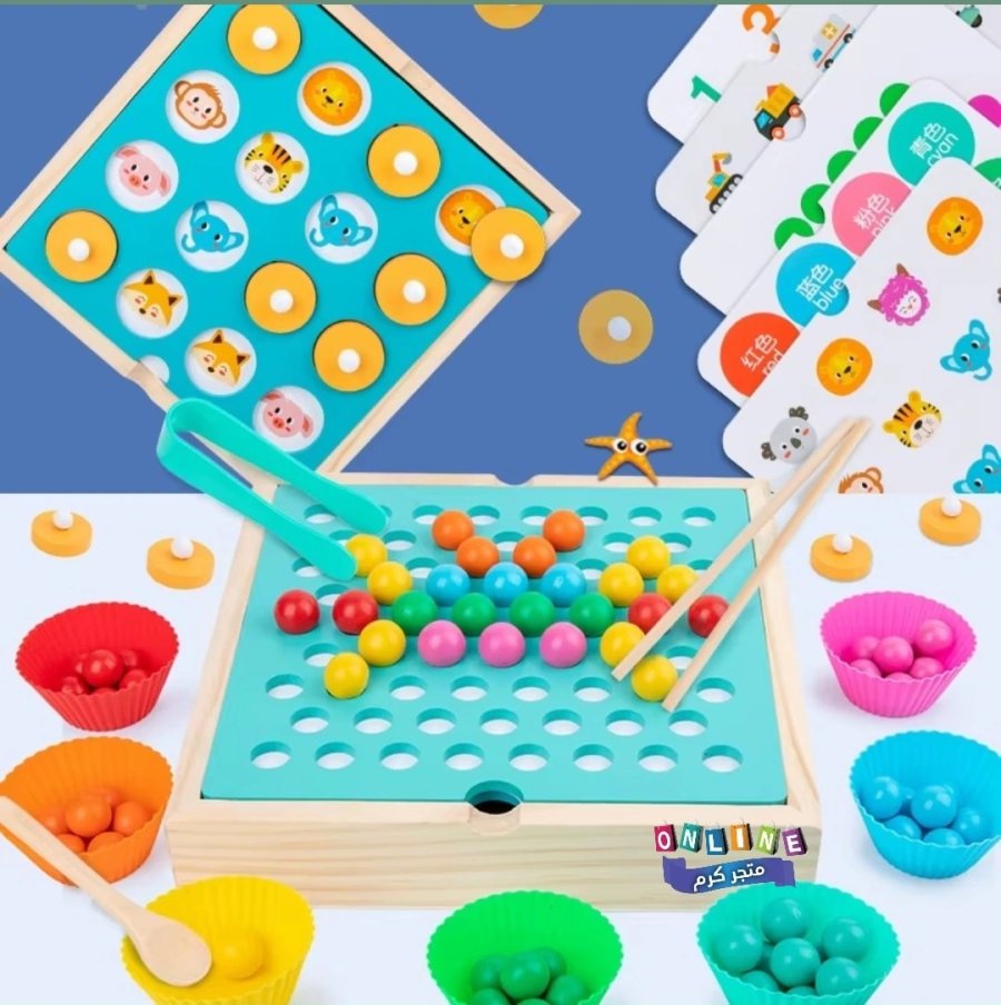 لعبة متعددة الوظائف تجمع بين تحدي الذاكرة والمهارات الحركية. يمكن للأطفال لعب "لعبة الذاكرة" أو استخدام الملاقط لالتقاط الكرات الملونة وتصنيفها حسب اللون.