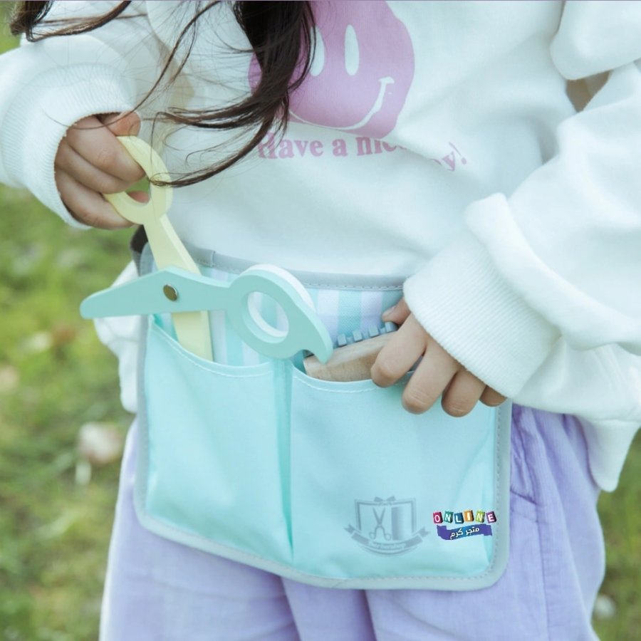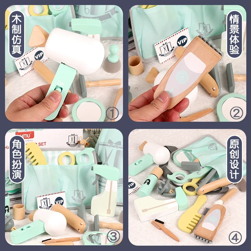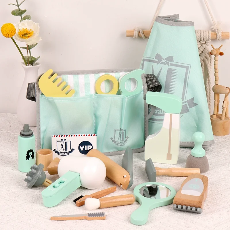 طقم لعبة حلاقة خشبية مع حقيبة تخزين ومجفف شعر ومرآة ومقص ومشط وشفرة وإكسسوارات تصفيف