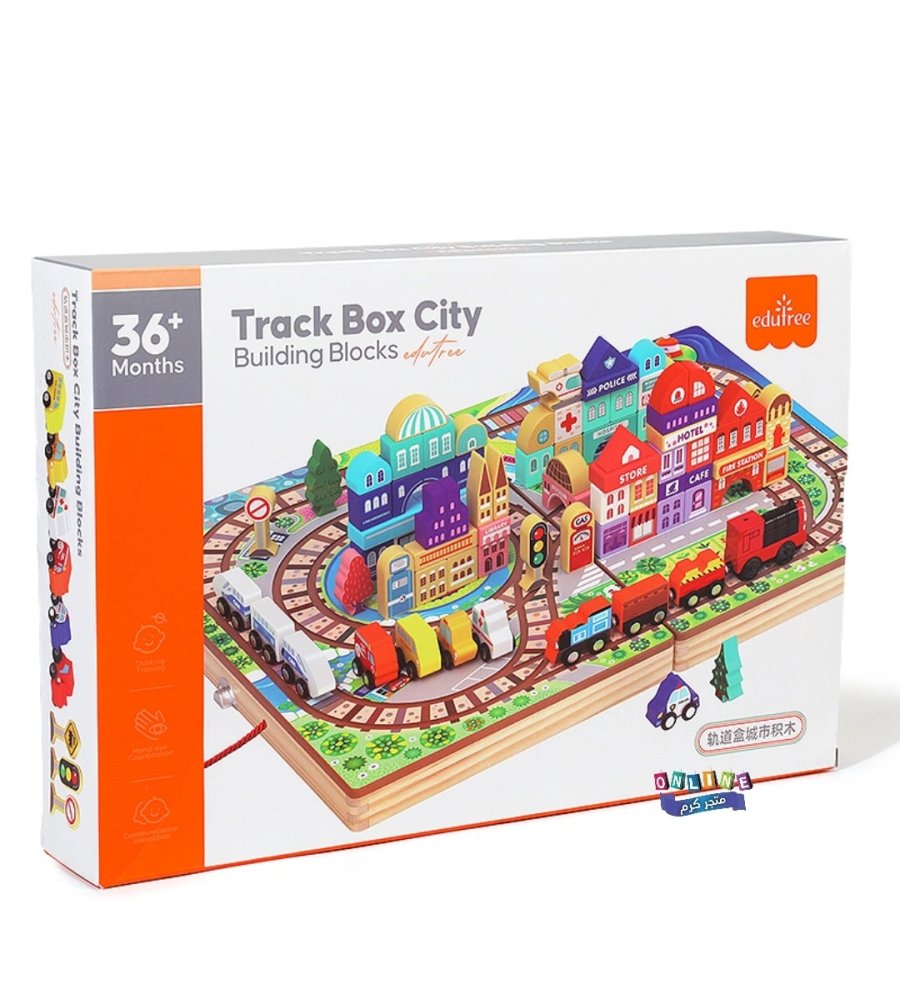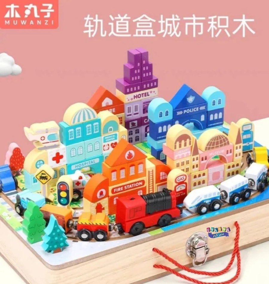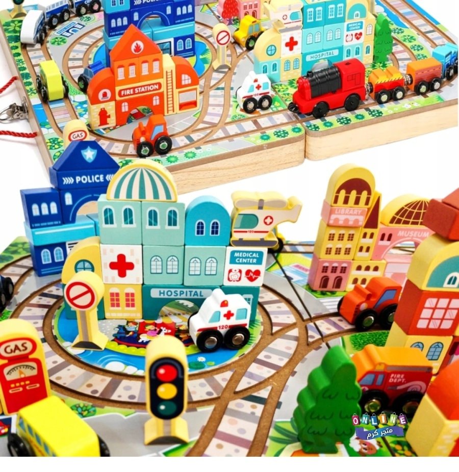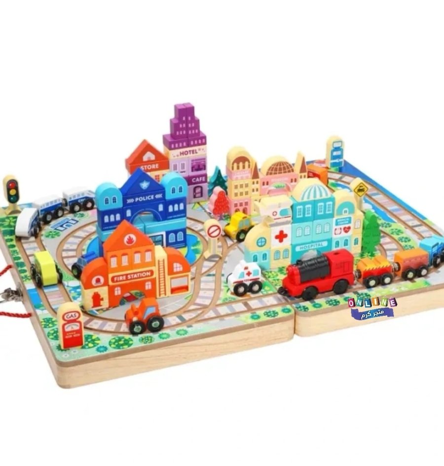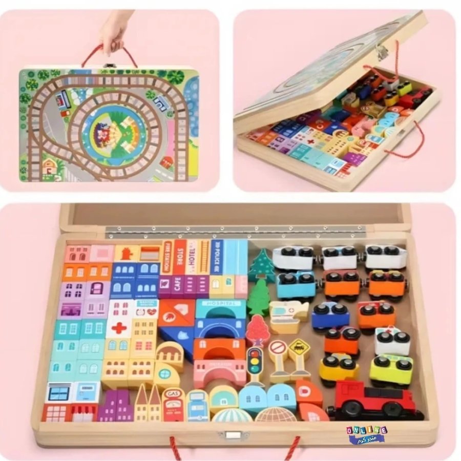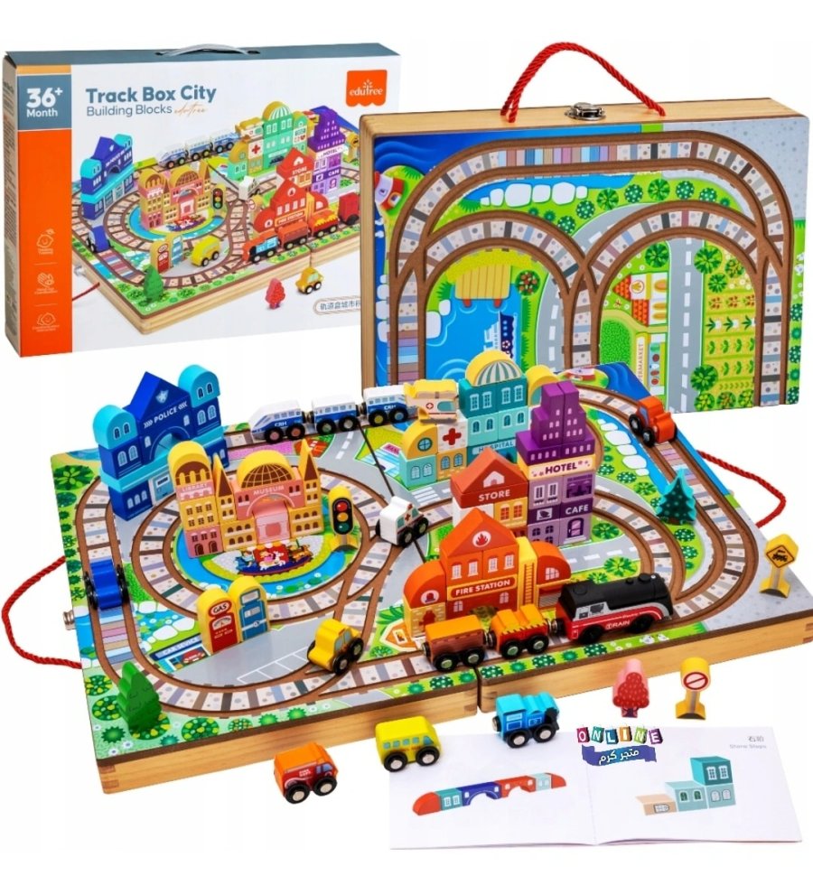 لعبة مدينة متكاملة تضم قطارات🚆، مبانٍ🏢، طرق🛣️، إشارات مرور🚦، وسيارات صغيرة🚗… كلّها في صندوق واحد محمول بسهولة 🎒✨