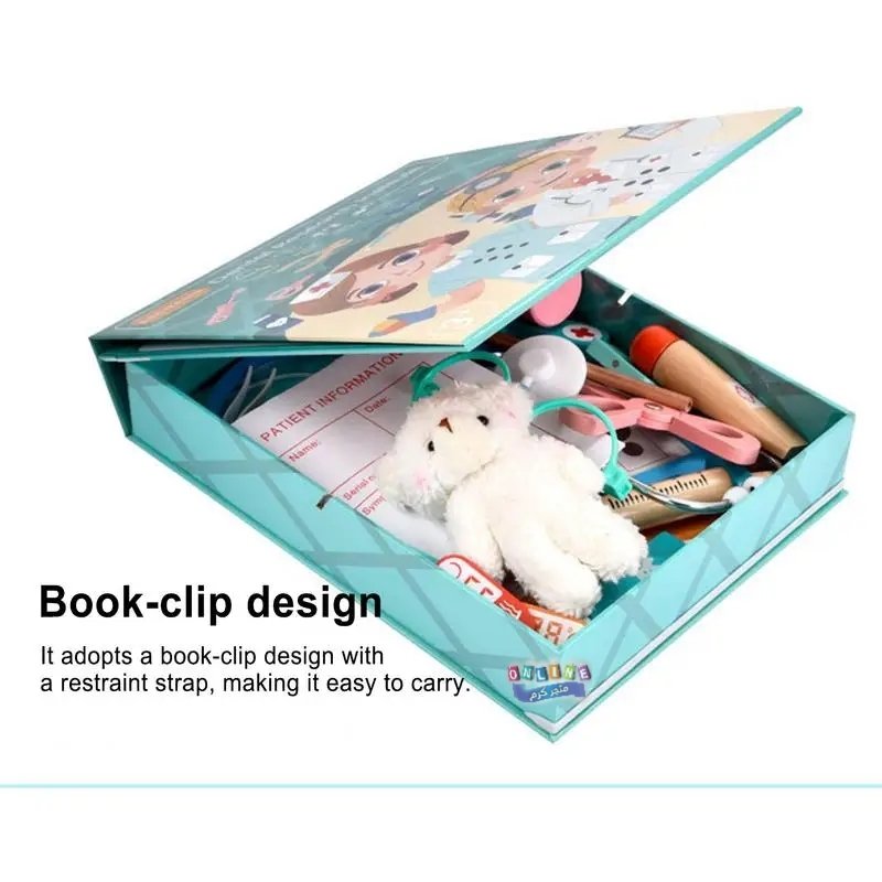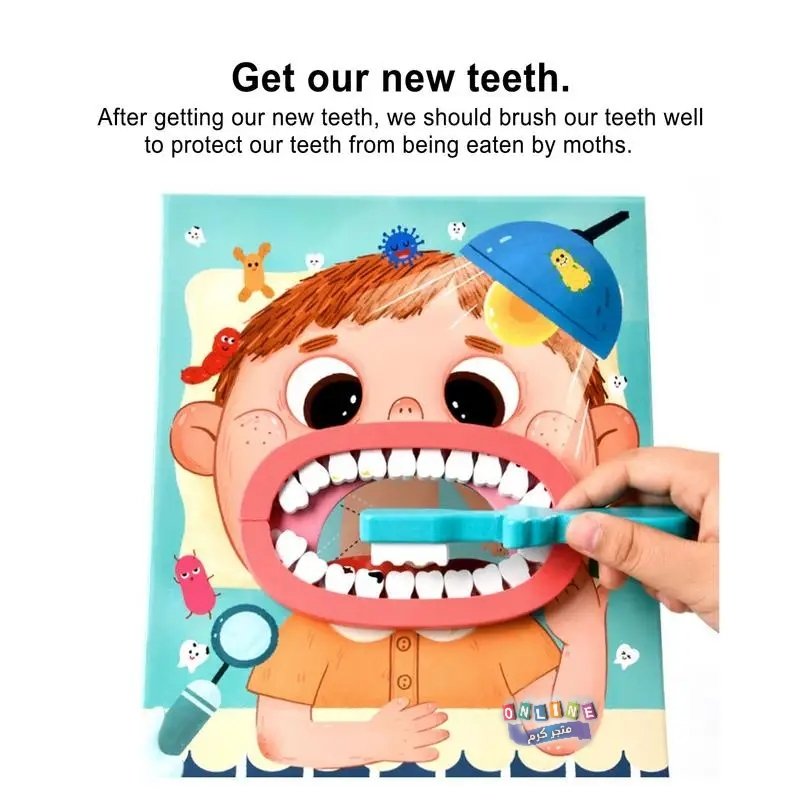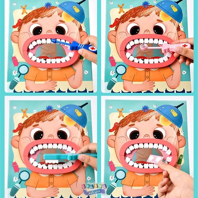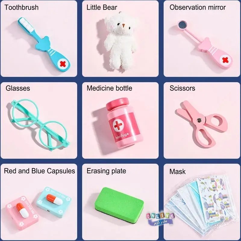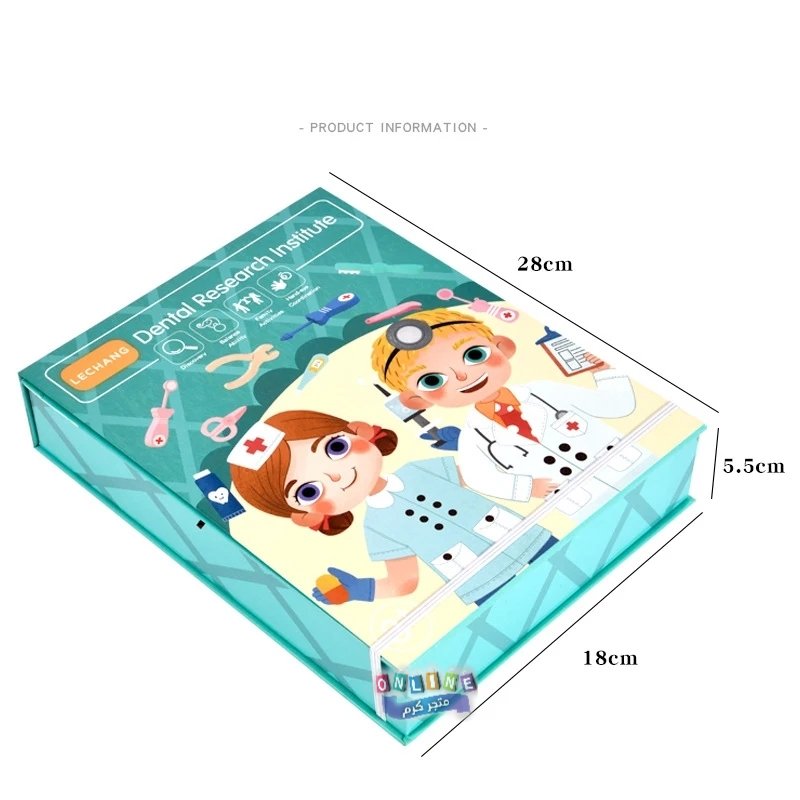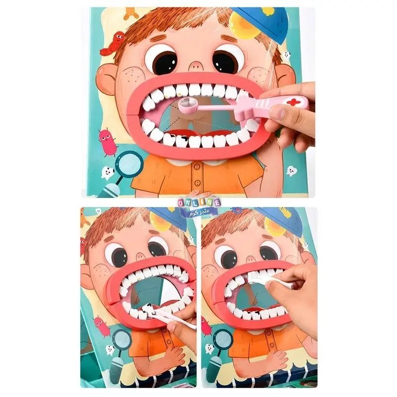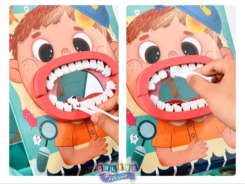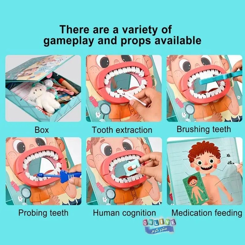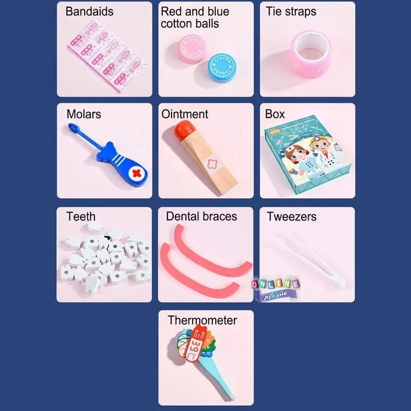 محتويات المجموعة: تتضمن مجموعة متنوعة من الأدوات التي تحاكي أدوات طبيب الأسنان الحقيقي، مثل فرشاة أسنان، ومقياس حرارة، وملاقط، وسماعة طبيب، ونموذج فم بشري بأسنان يمكن فحصها وتنظيفها.