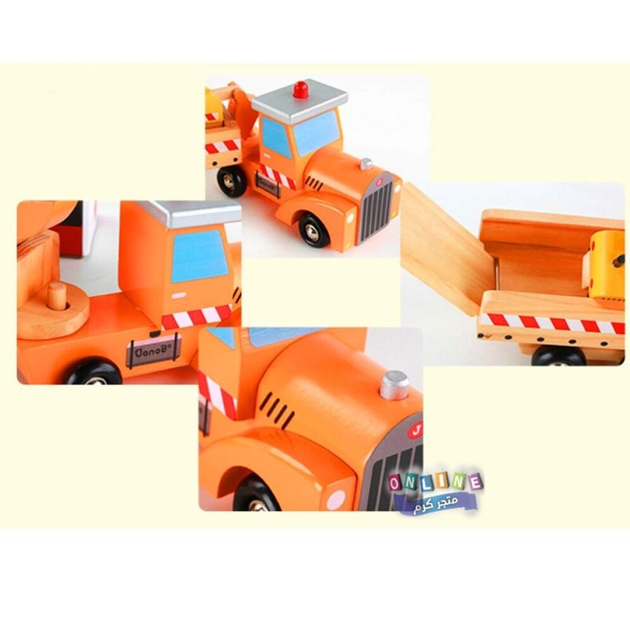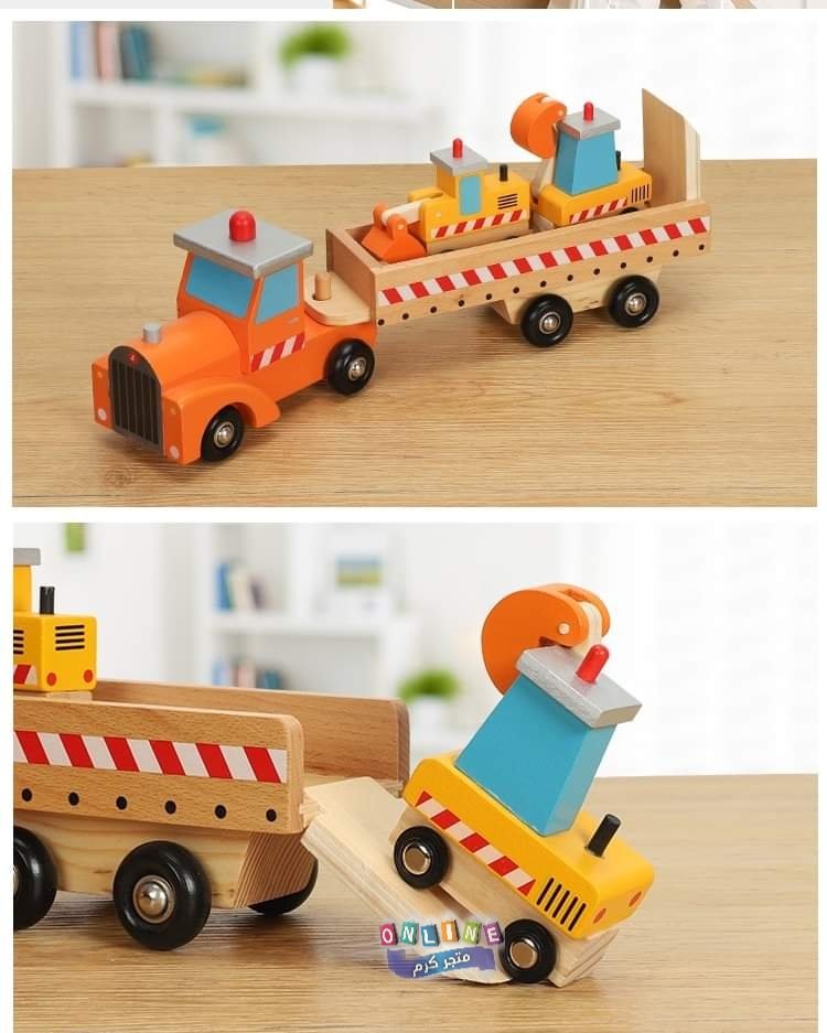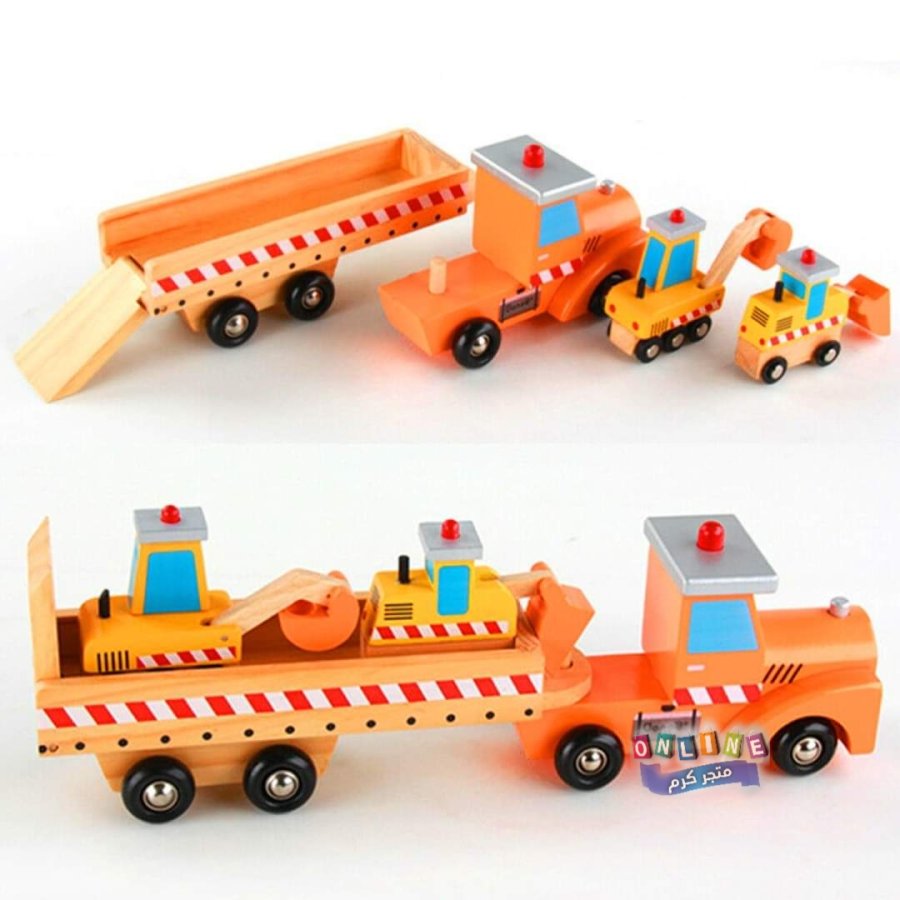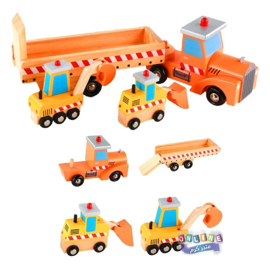 لعبة مركبات بناء خشبية تتضمن شاحنة نقل وحفارتين صغيرتين.