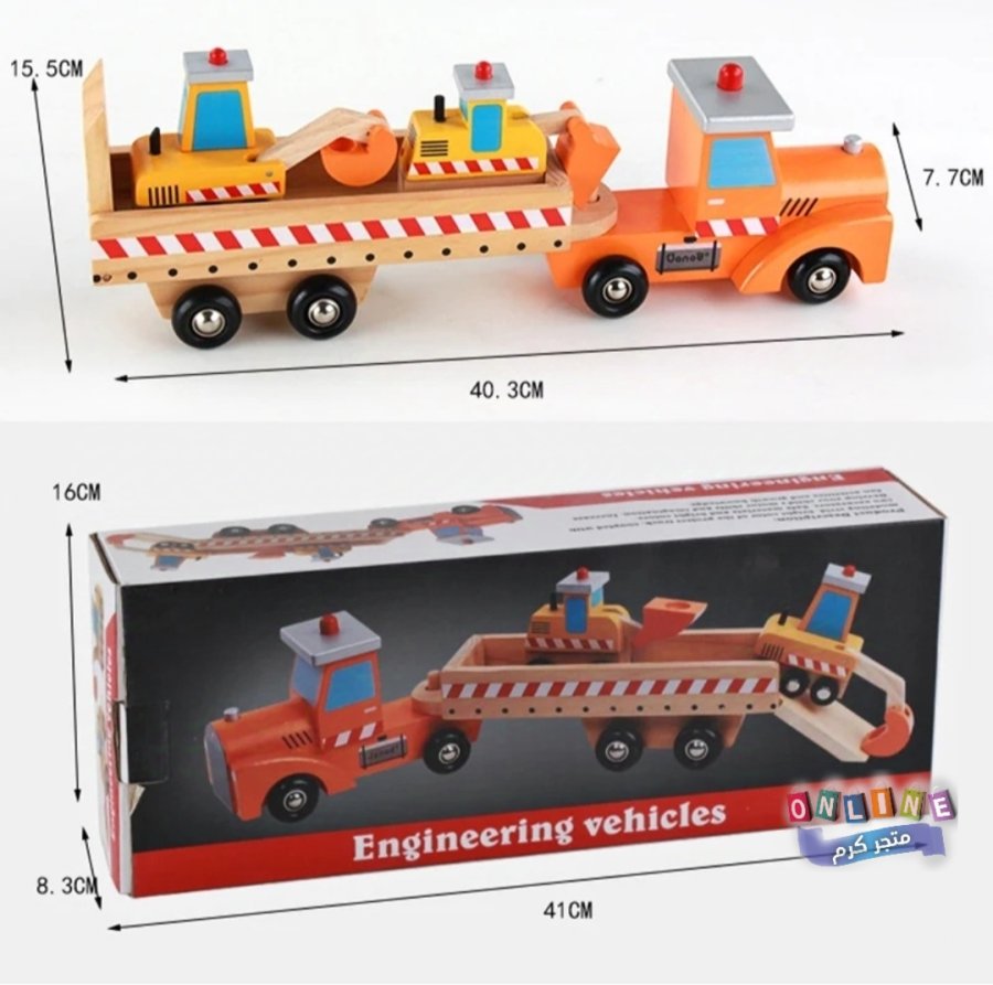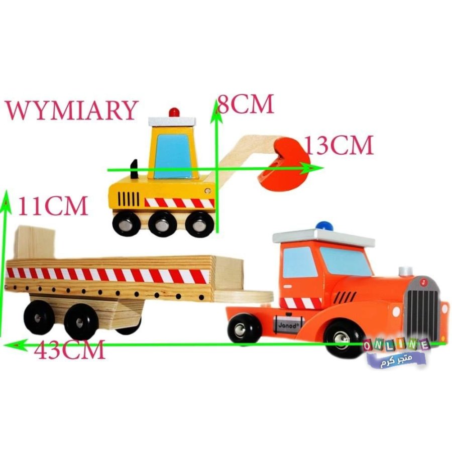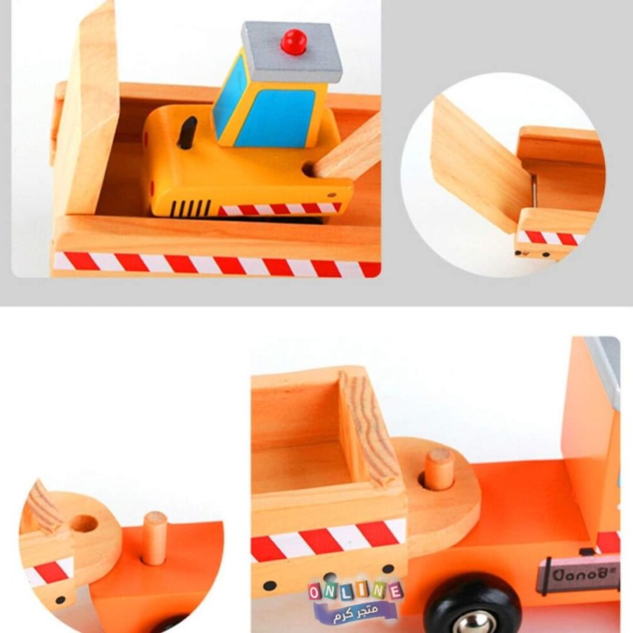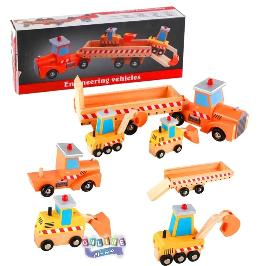 لعبة مركبات بناء خشبية تتضمن شاحنة نقل وحفارتين صغيرتين.