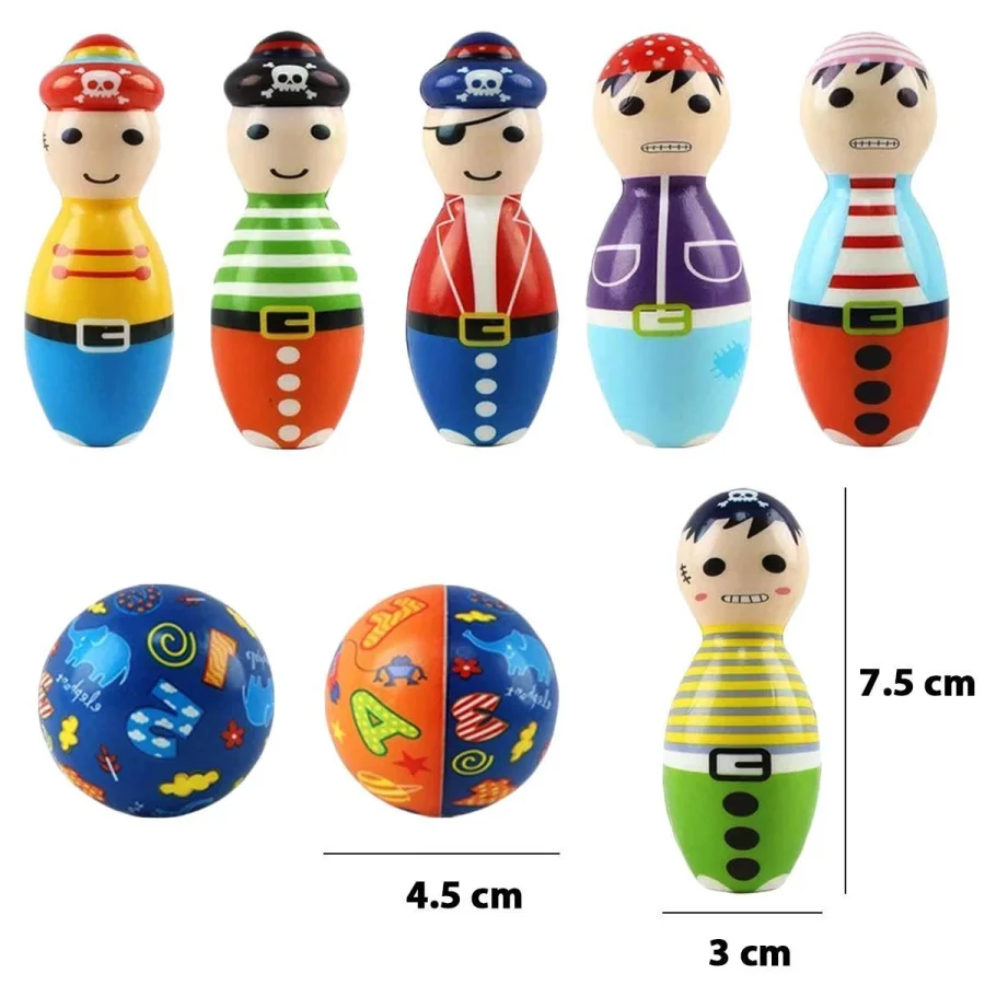 المحتويات: يتضمن الطقم عادةً 6 دبابيس (قوارير) بولينج ناعمة بتصميم شخصيات قراصنة وكرتين ناعمتين.