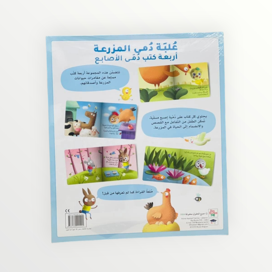 تُعد هذه علبة "دمى المزرعة"، وهي مجموعة تعليمية وتفاعلية مخصصة للأطفال. تتضمن العلبة أربعة كتب مختلفة، كل كتاب منها يركز على شخصية حيوان من المزرعة ويحتوي على دمية إصبع لجعل القصة أكثر حيوية وتفاعلية.