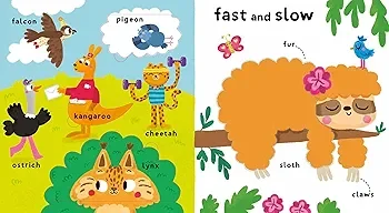 كتابٌ رائعٌ من الورق المقوى عن الحيوانات البرية، يتميز بصفحاتٍ قابلةٍ للطيّ، ورسوماتٍ ملونةٍ زاهية، وعناصر حسيةٍ كبيرةٍ تجذب انتباه الطفل!