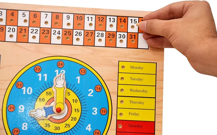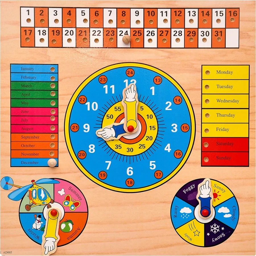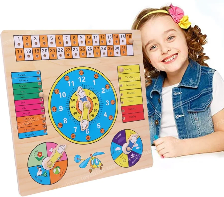 لعبة تعليمية خشبية تفاعلية تساعد الطفل على التعرّف إلى الوقت، أيام الأسبوع، أشهر السنة، الفصول الأربعة وحالات الطقس بأسلوب شيّق ومحبّب. تصميمها الملوّن وعقاربها المتحركة يحفّزان الطفل على التعلّم الذاتي وينمّيان مهارات التركيز، الملاحظة، والتفكير.