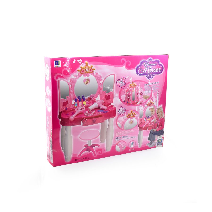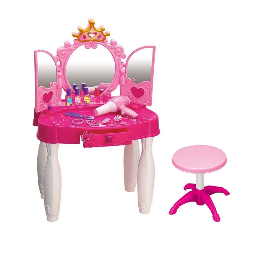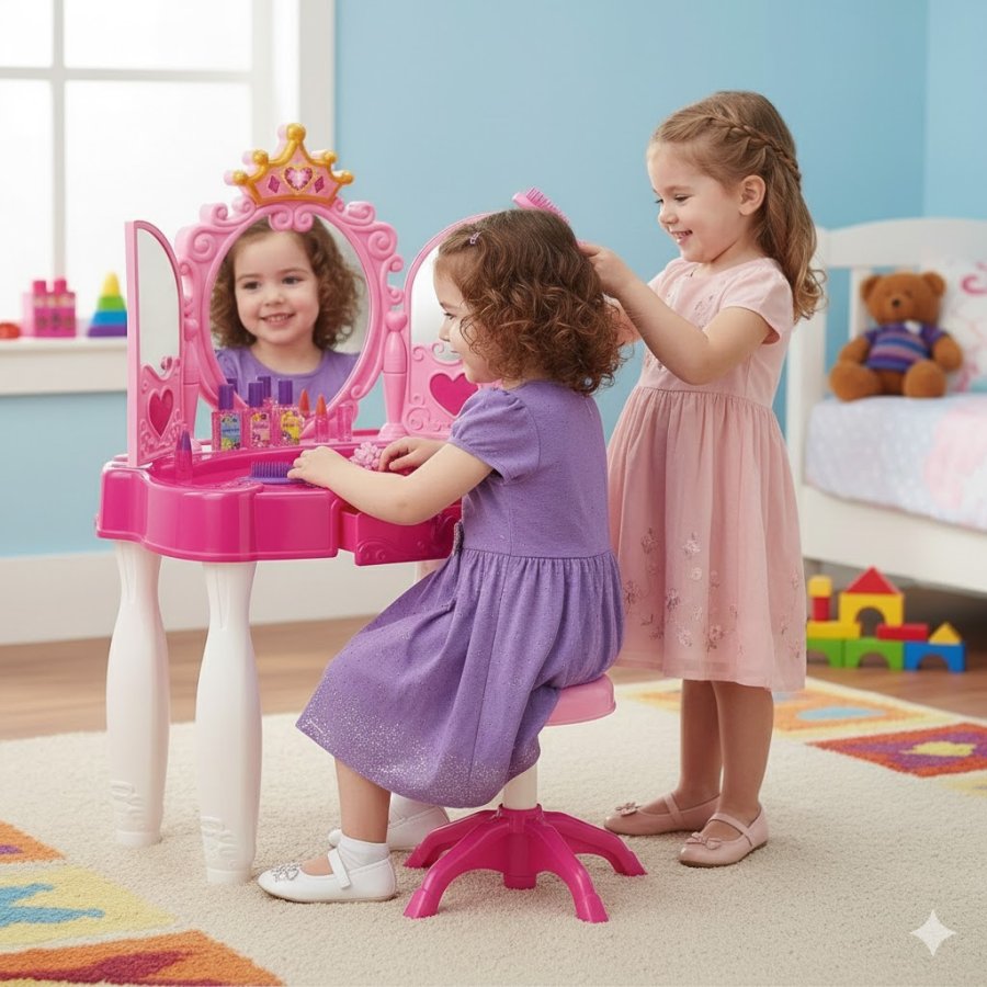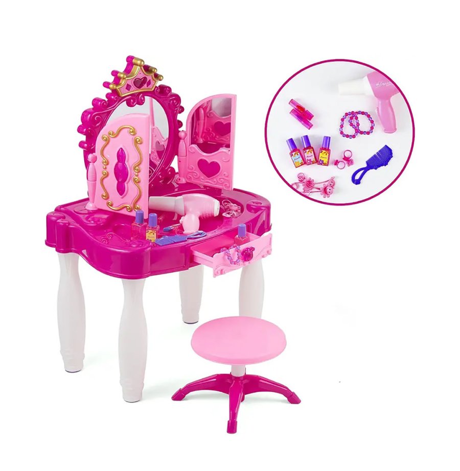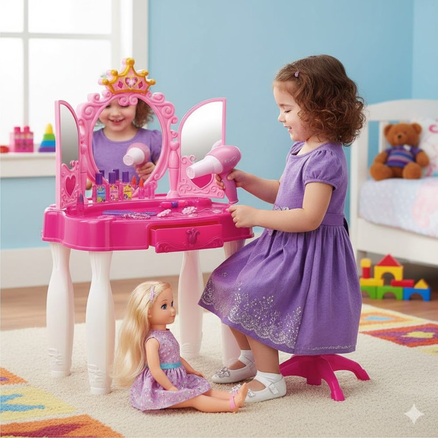 اجعلي وقت اللعب أكثر متعة لطفلتك مع طاولة المكياج الجميلة المصممة بأسلوب الأميرات. تتميز بمرآة أنيقة وتصميم وردي جذاب مع مجموعة من إكسسوارات التجميل اللعبة مثل مجفف الشعر، العطور وأدوات الزينة، لتمنح الأطفال تجربة لعب مليئة بالخيال والمرح. كما تساعد الطفلة على تقليد الكبار وتنمية الإبداع أثناء اللعب.