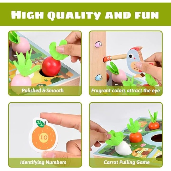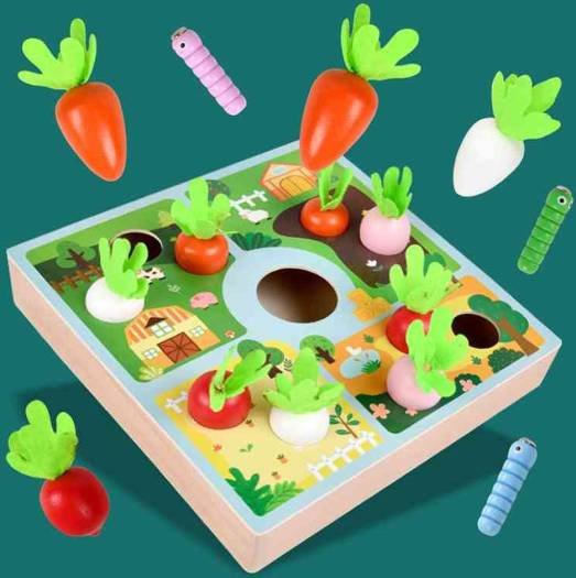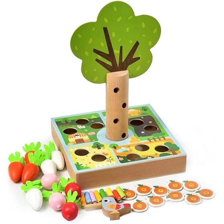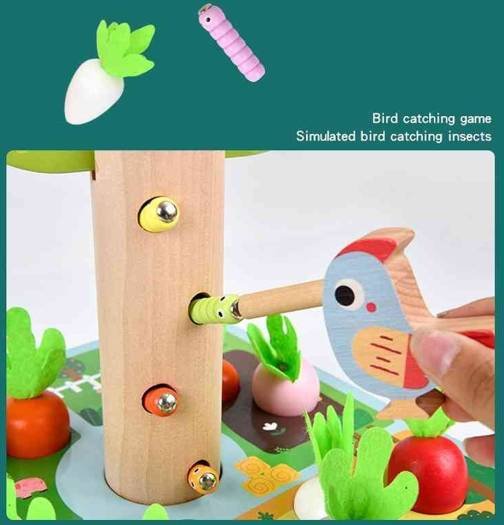 صيد الديدان المغناطيسي: يستخدم الطفل طائراً خشبياً (مثل النجار) مزوداً بمغناطيس لالتقاط الديدان الملونة من جذع الشجرة وإطعامها للصغير.
