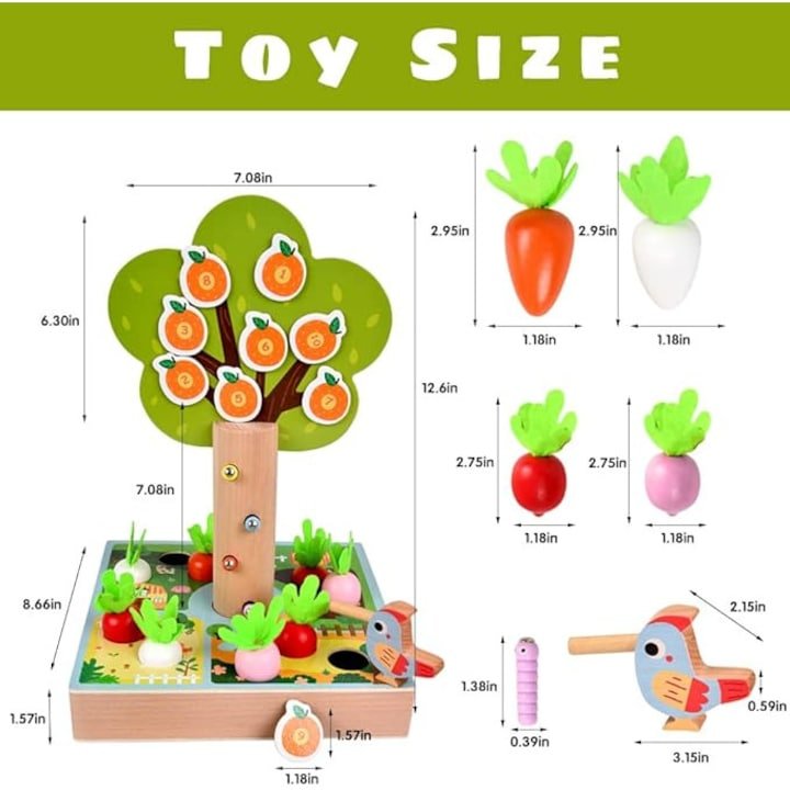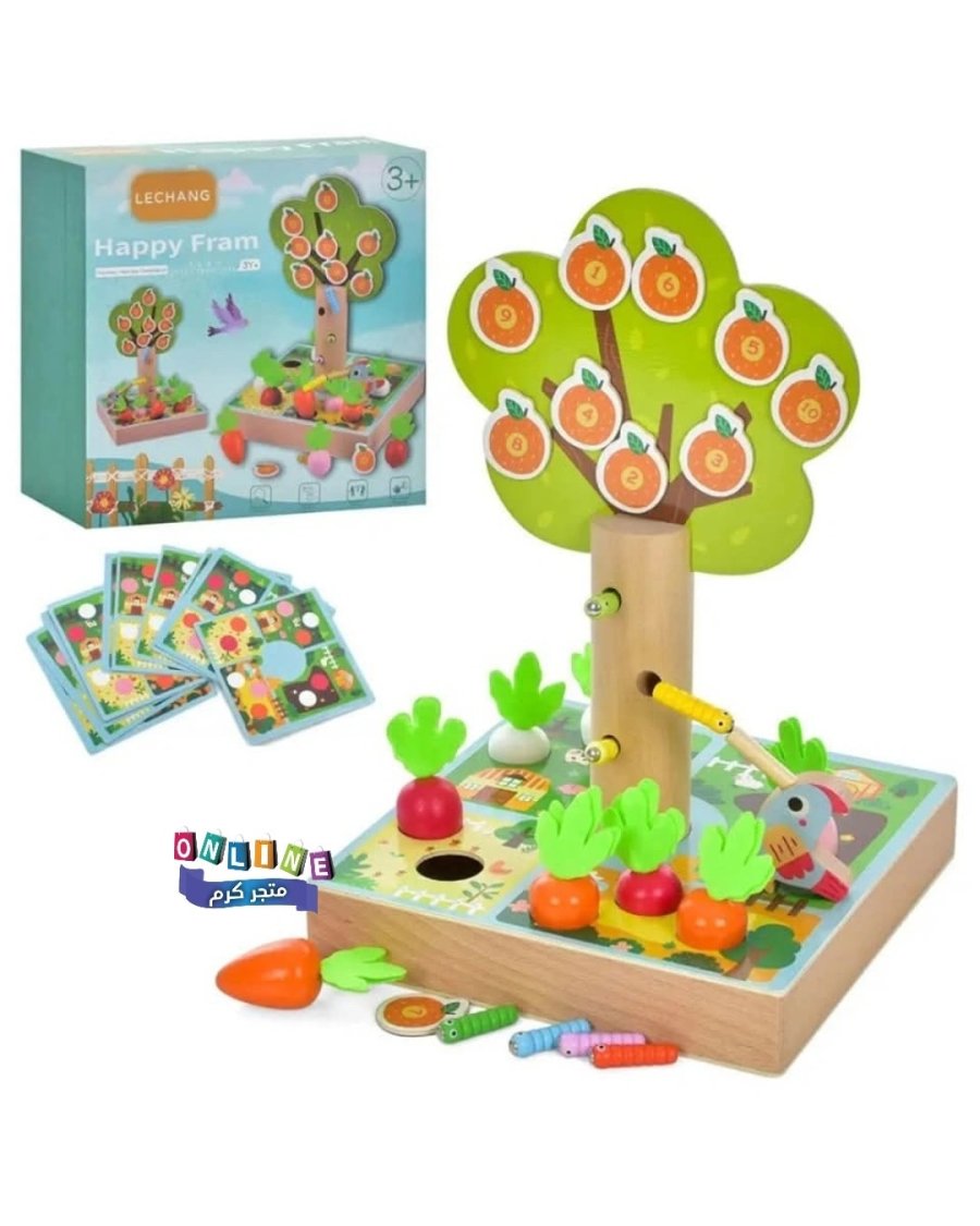 المكونات: قاعدة خشبية (المزرعة)، شجرة مغناطيسية، ثمار مرقمة، جزر بأحجام مختلفة، ديدان ملونة، وطائر مغناطيسي.