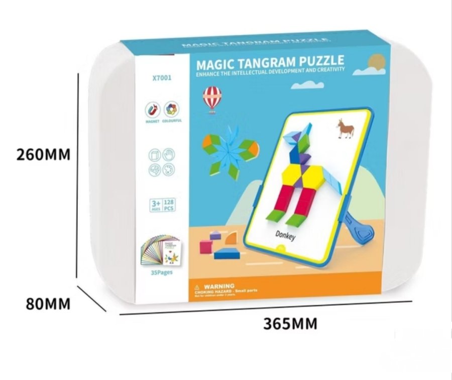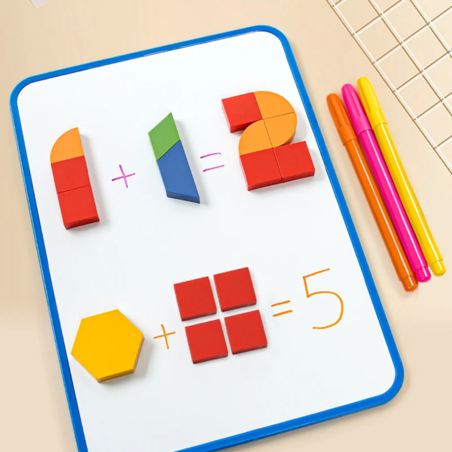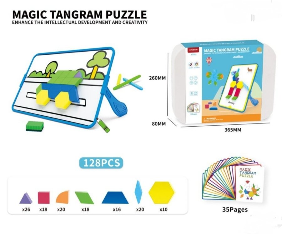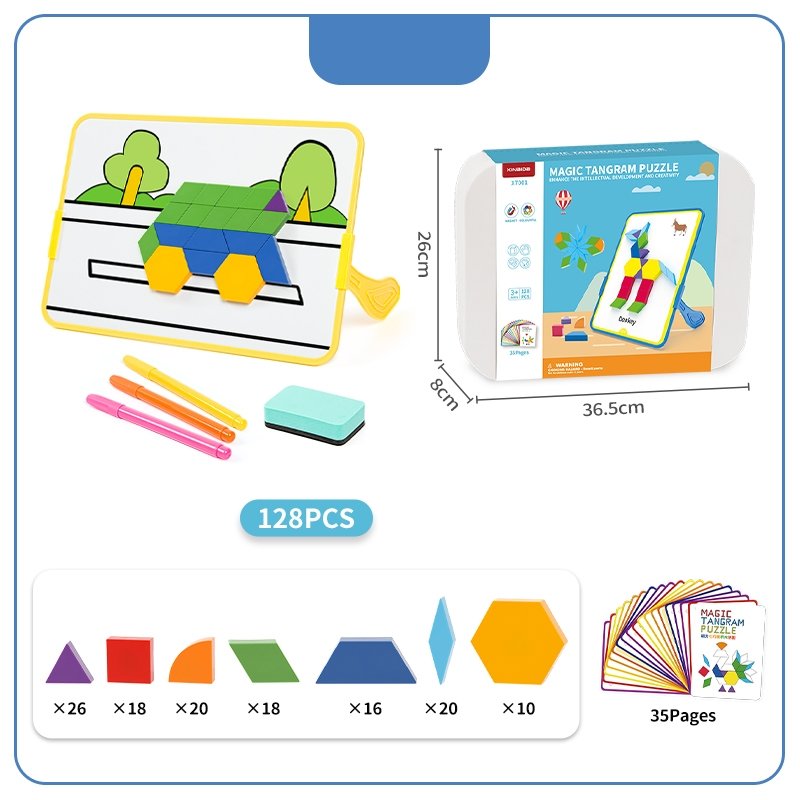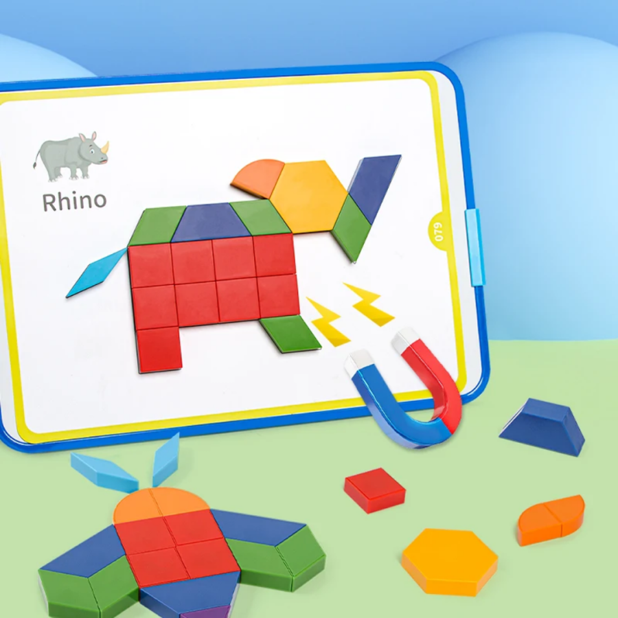 تشتمل المجموعة عادةً على لوحة رسم مغناطيسية، وقطع بناء بأشكال هندسية وألوان متنوعة، بالإضافة إلى دليل إرشادي (كتيب) يحتوي على نماذج للأشكال.