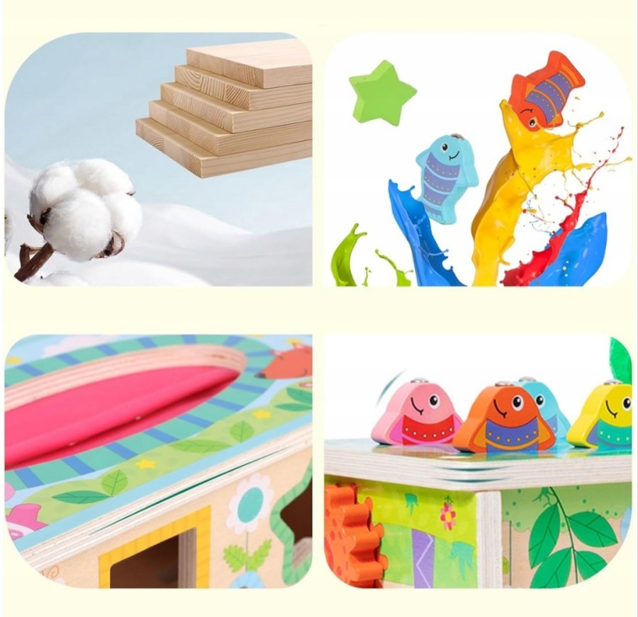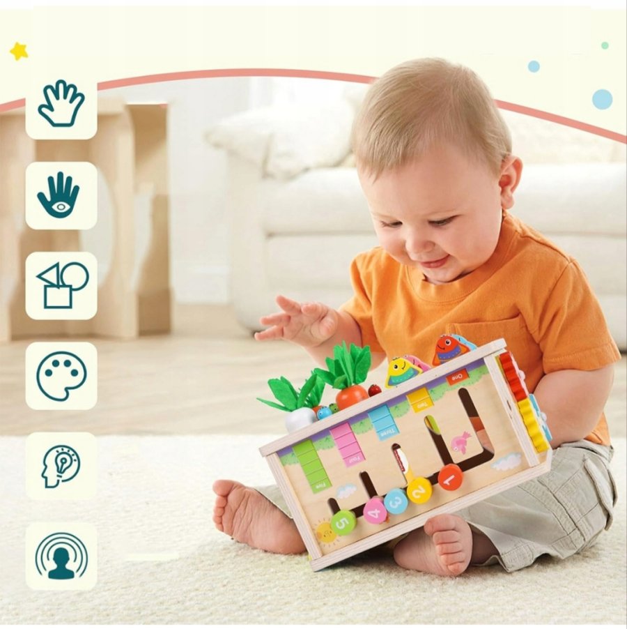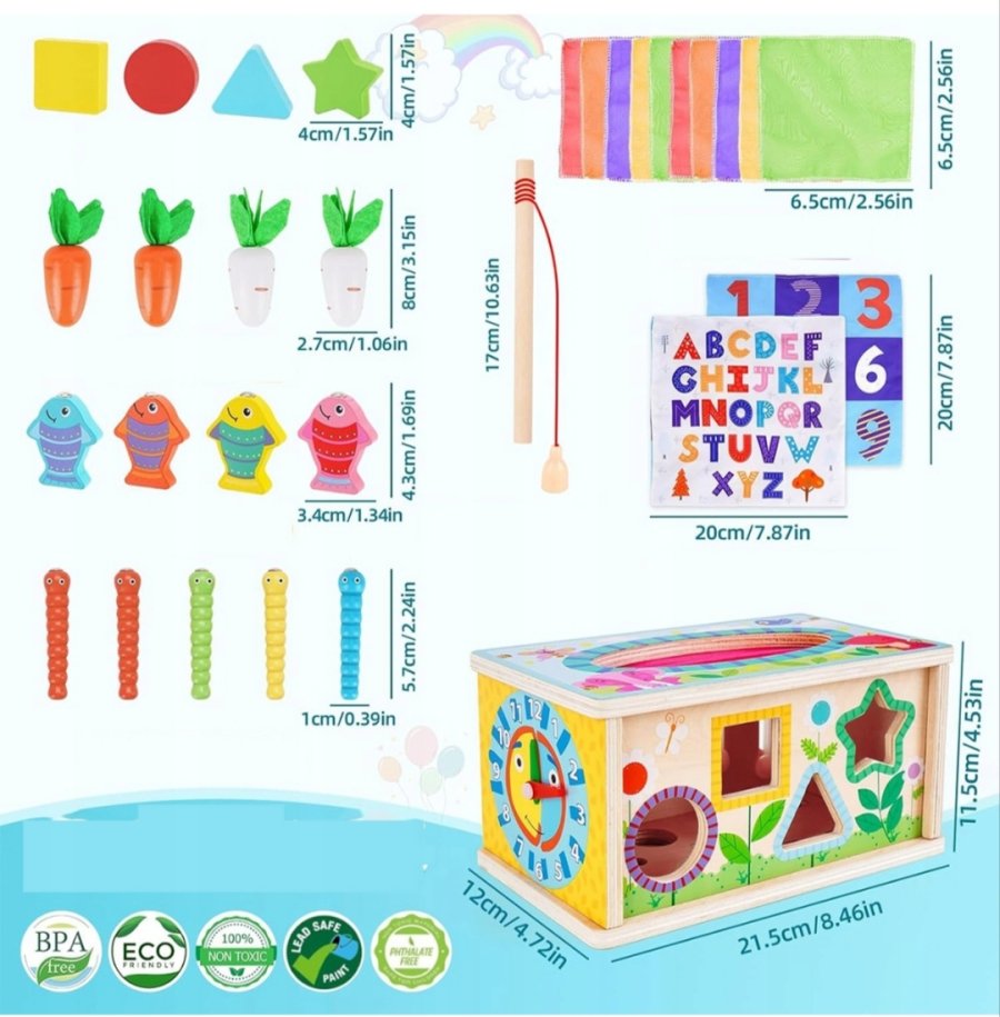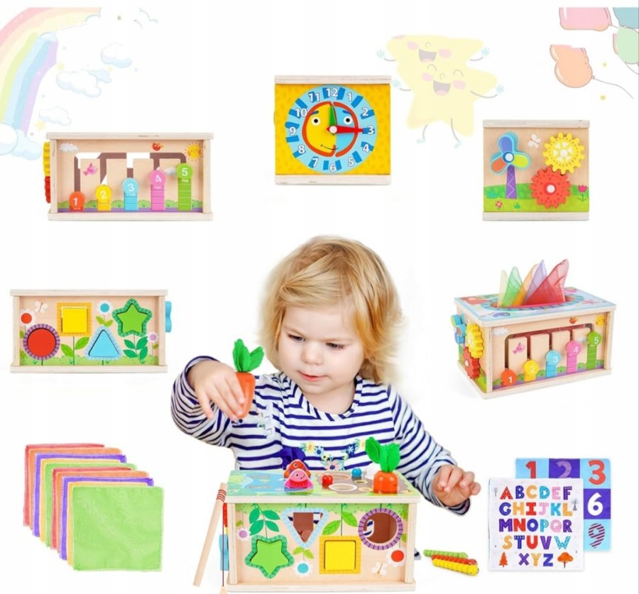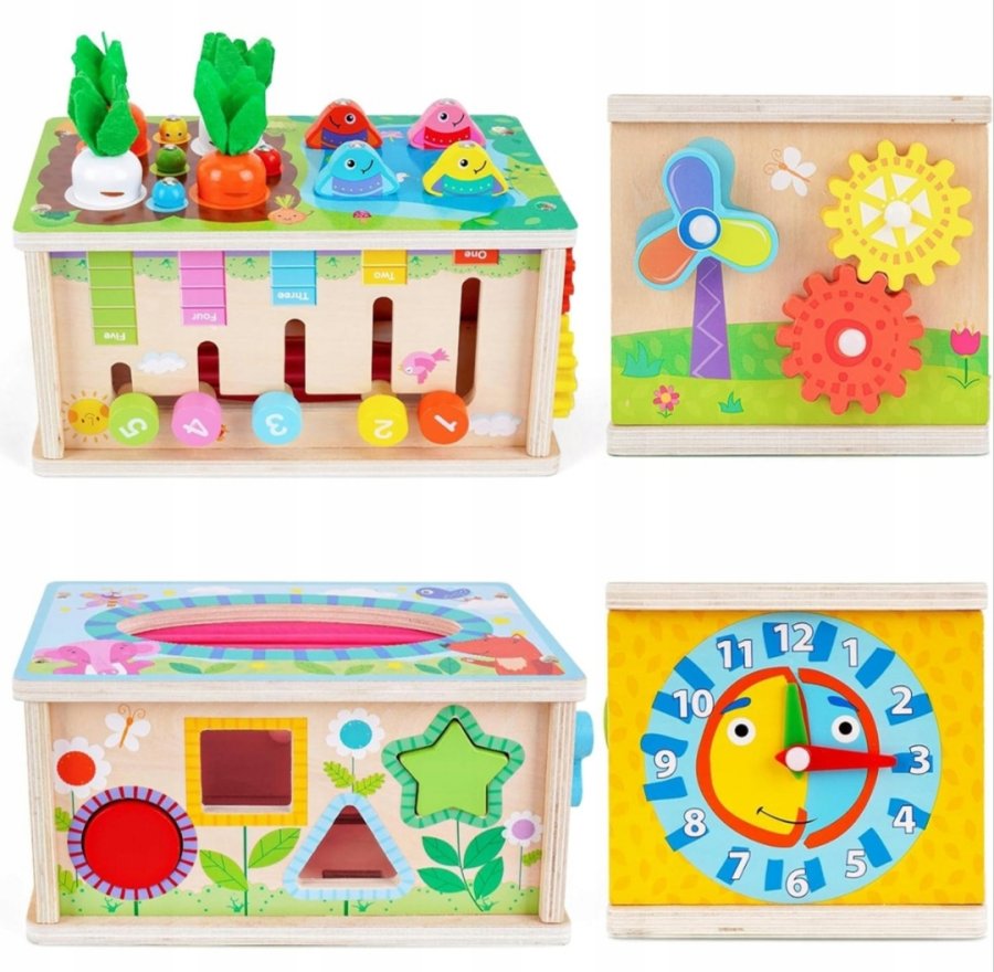 تجمع هذه اللعبة "6 في 1" بين عدة أنشطة في صندوق خشبي واحد لتعزيز المهارات المختلفة لدى الطفل