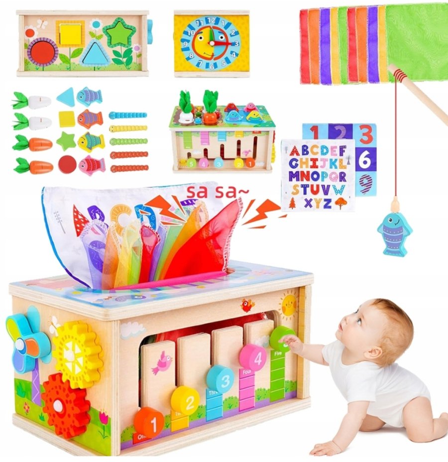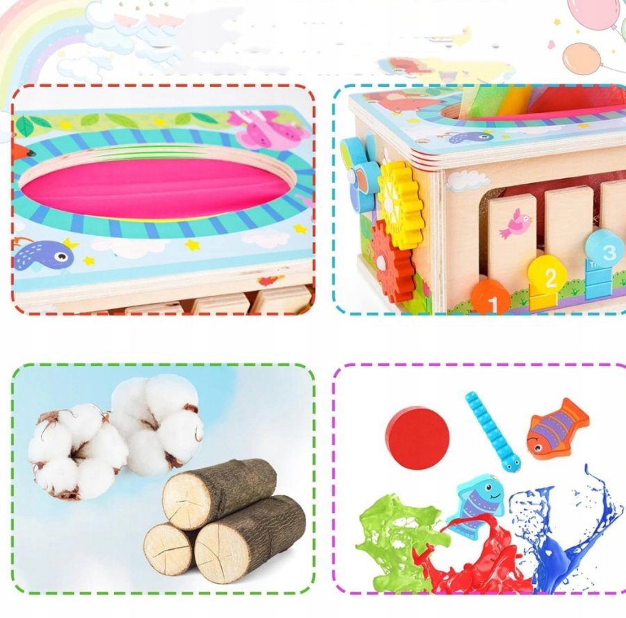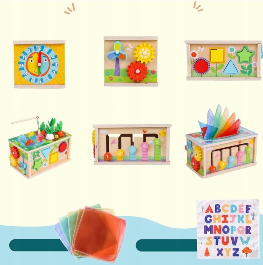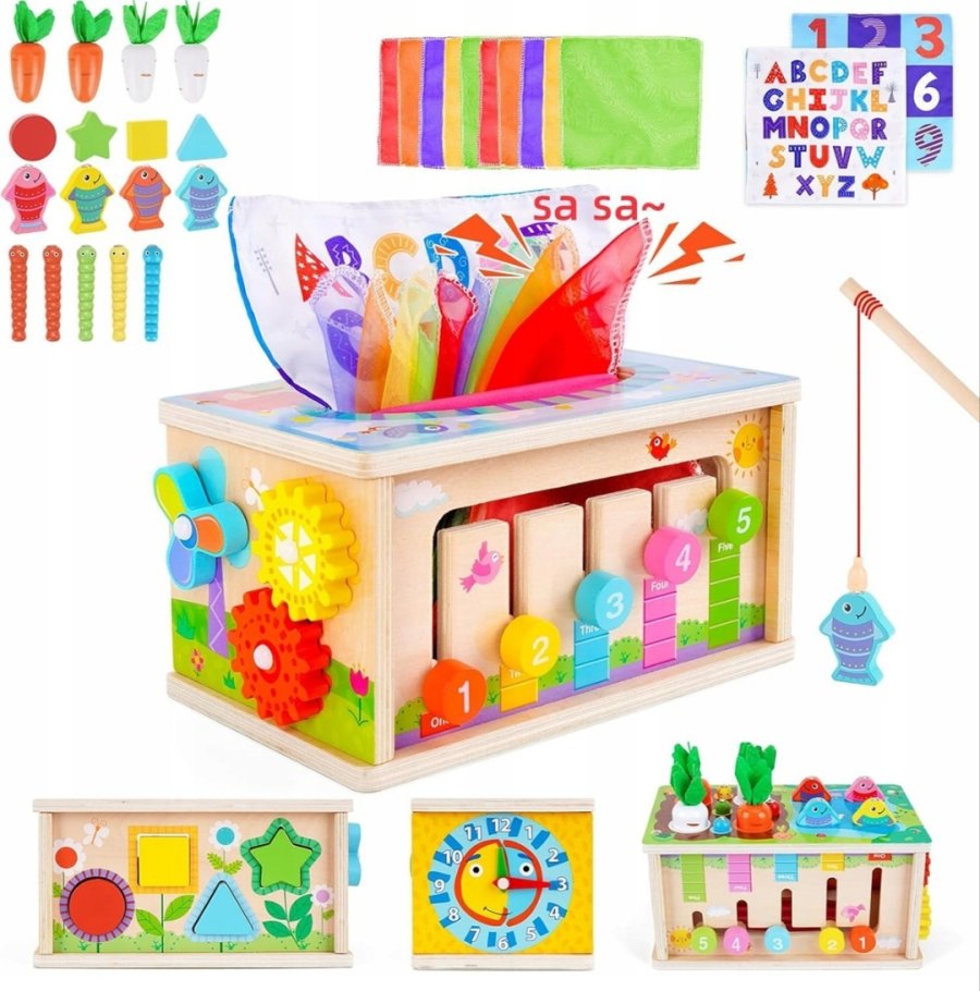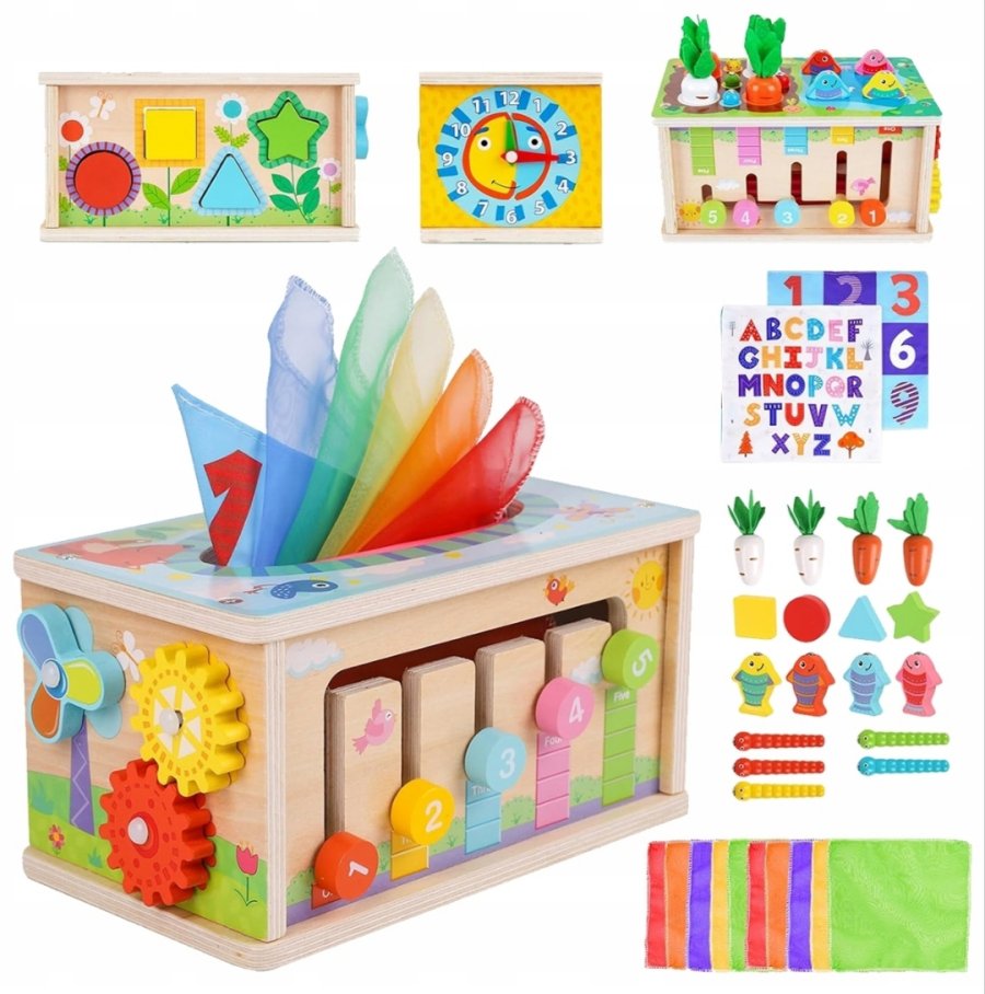 تحتوي جوانب الصندوق أنشطة مختلفة ، ساعة تعليمية، ومنطقة مخصصة لسحب المناديل القماشية الملونة لمحاكاة سحب المناديل الورقية الحقيقية.