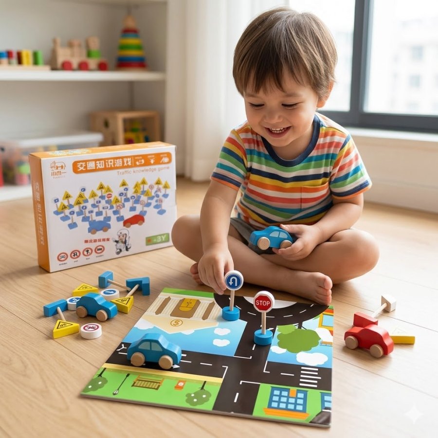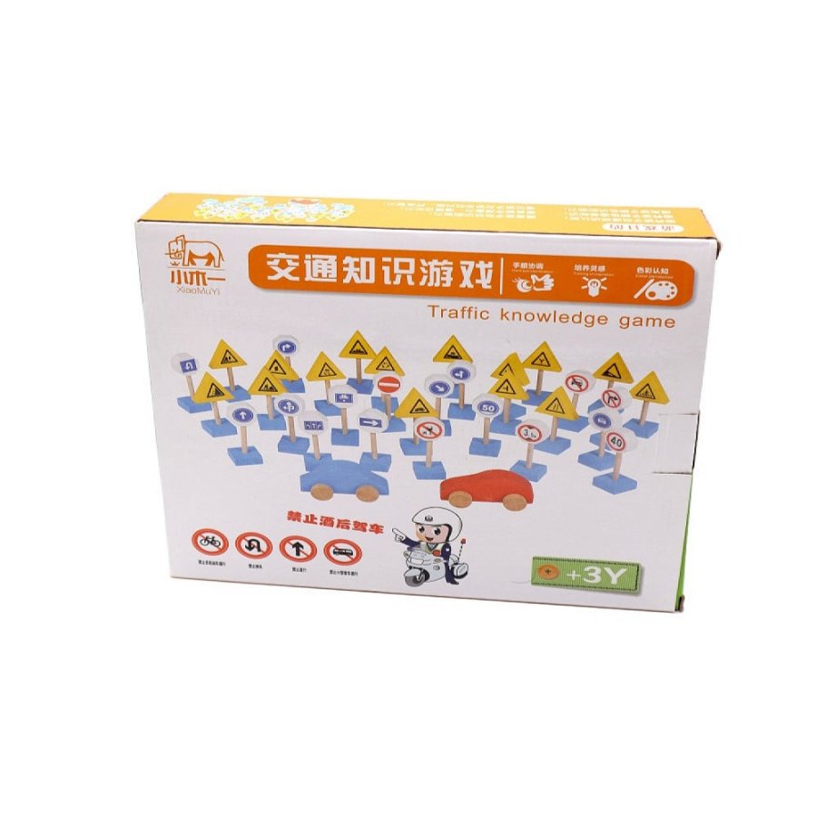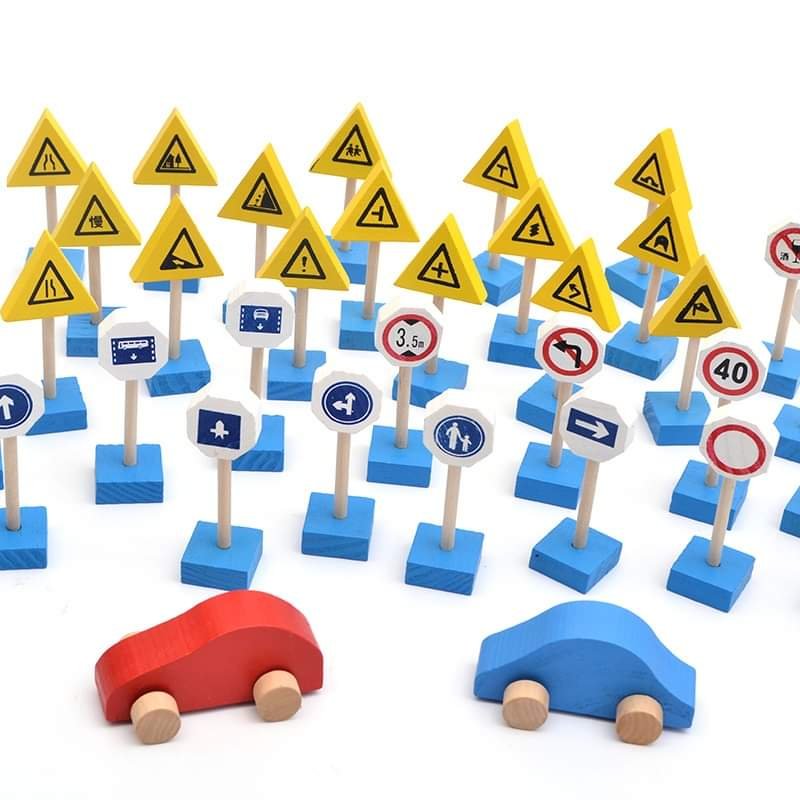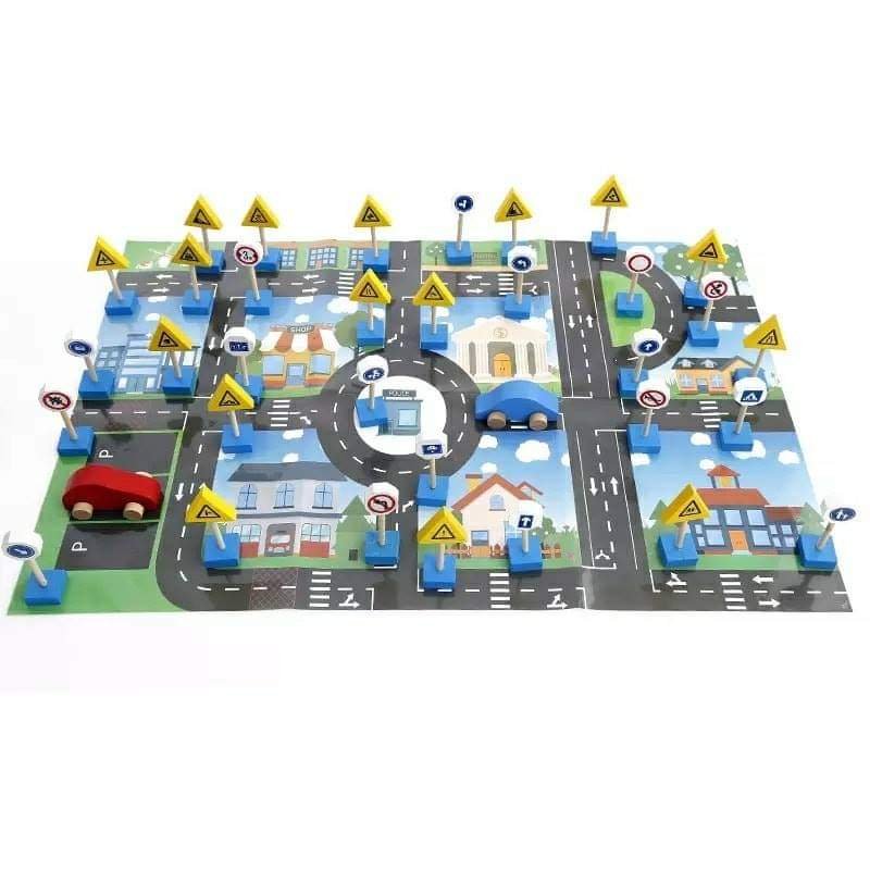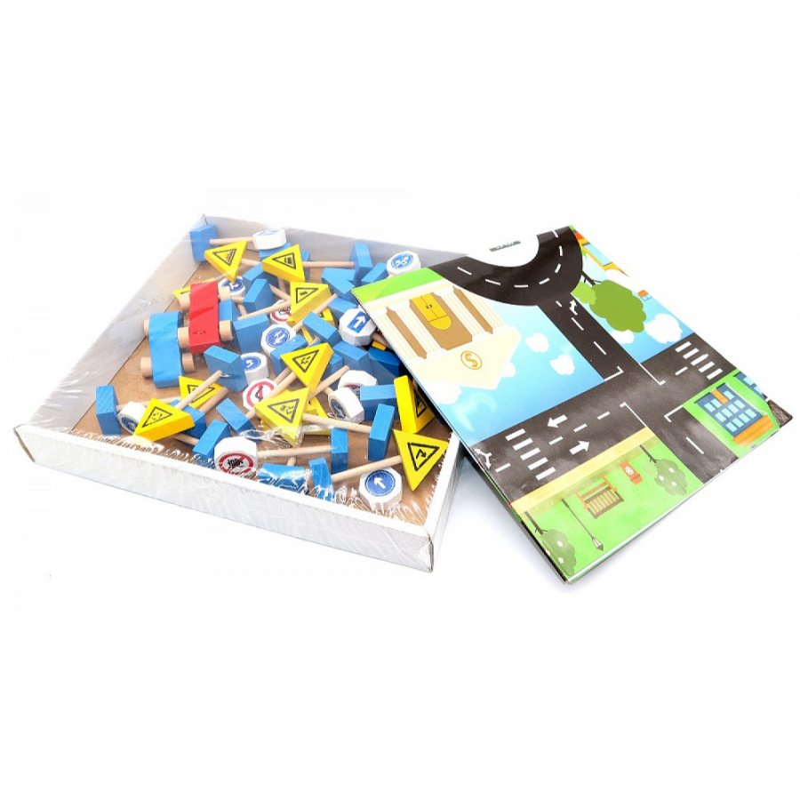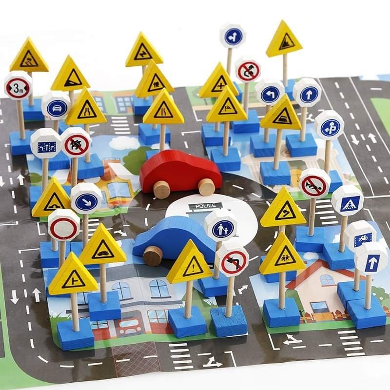 - تحتوي على إشارات مرور خشبية صغيرة بأشكال وألوان مختلفة، بالإضافة إلى سيارات مصغرة وقطع تمثل مبانٍ أو عناصر من المدينة.
