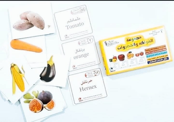 التعريف بالخضروات والفواكه باللغتين العربية والإنجليزية (عادة ما يوجد الاسم في خلفية البطاقة).