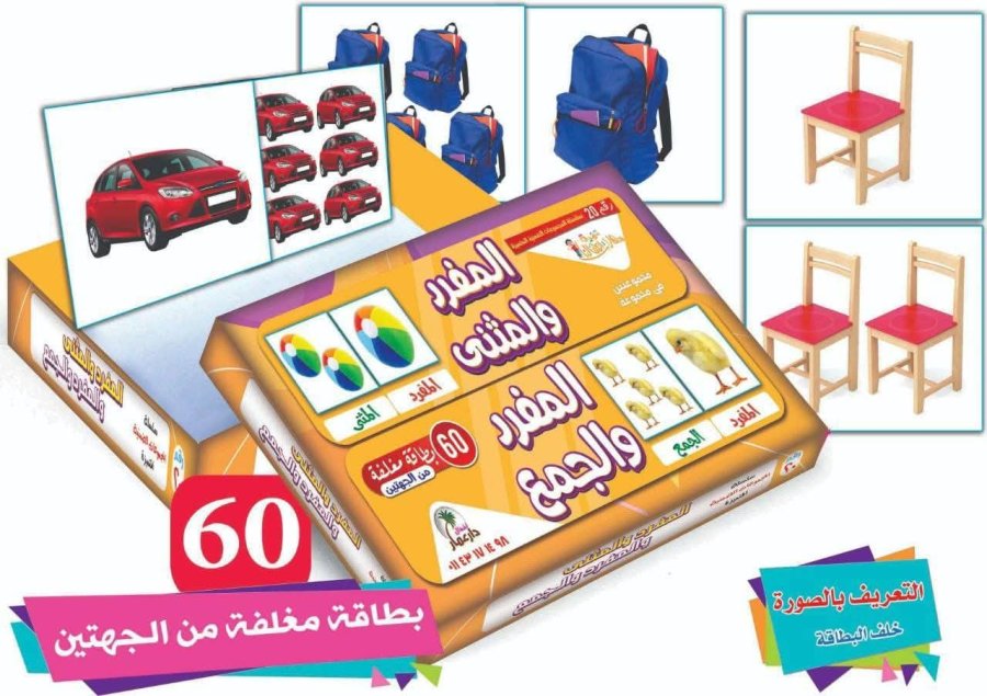 تصميم تفاعلي: تستخدم الصور لربط الكلمة بالعدد، مثل صور السيارات، الكراسي، والحقائب.