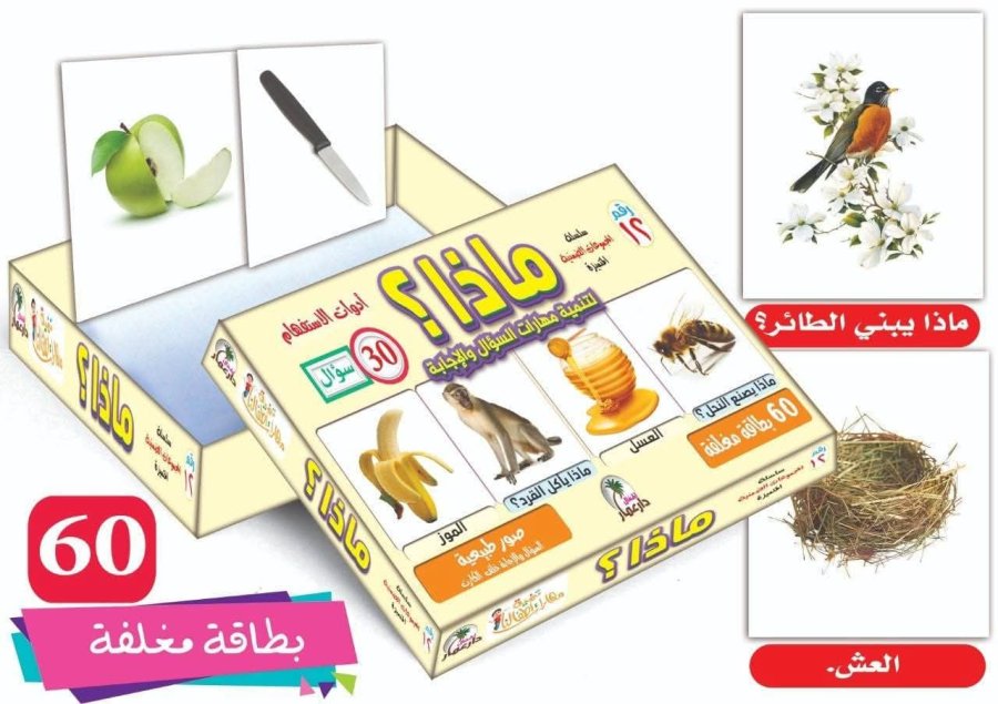 الهدف التعليمي: تساعد الطفل (خاصة من سن سنتين) على تعلم استخدام أداة الاستفهام "ماذا" وفهم طبيعة الأشياء ومواصفاتها، مثل "ماذا يأكل القرد؟" أو "ماذا يصنع النحل؟".