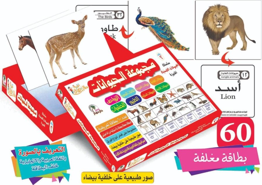 تعرض البطاقات صوراً طبيعية للحيوانات على خلفية بيضاء لتقليل التشتت البصري، مع كتابة اسم الحيوان باللغتين العربية والإنجليزية.